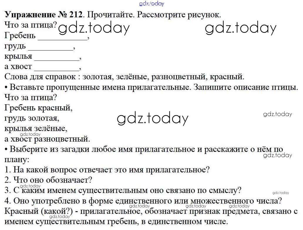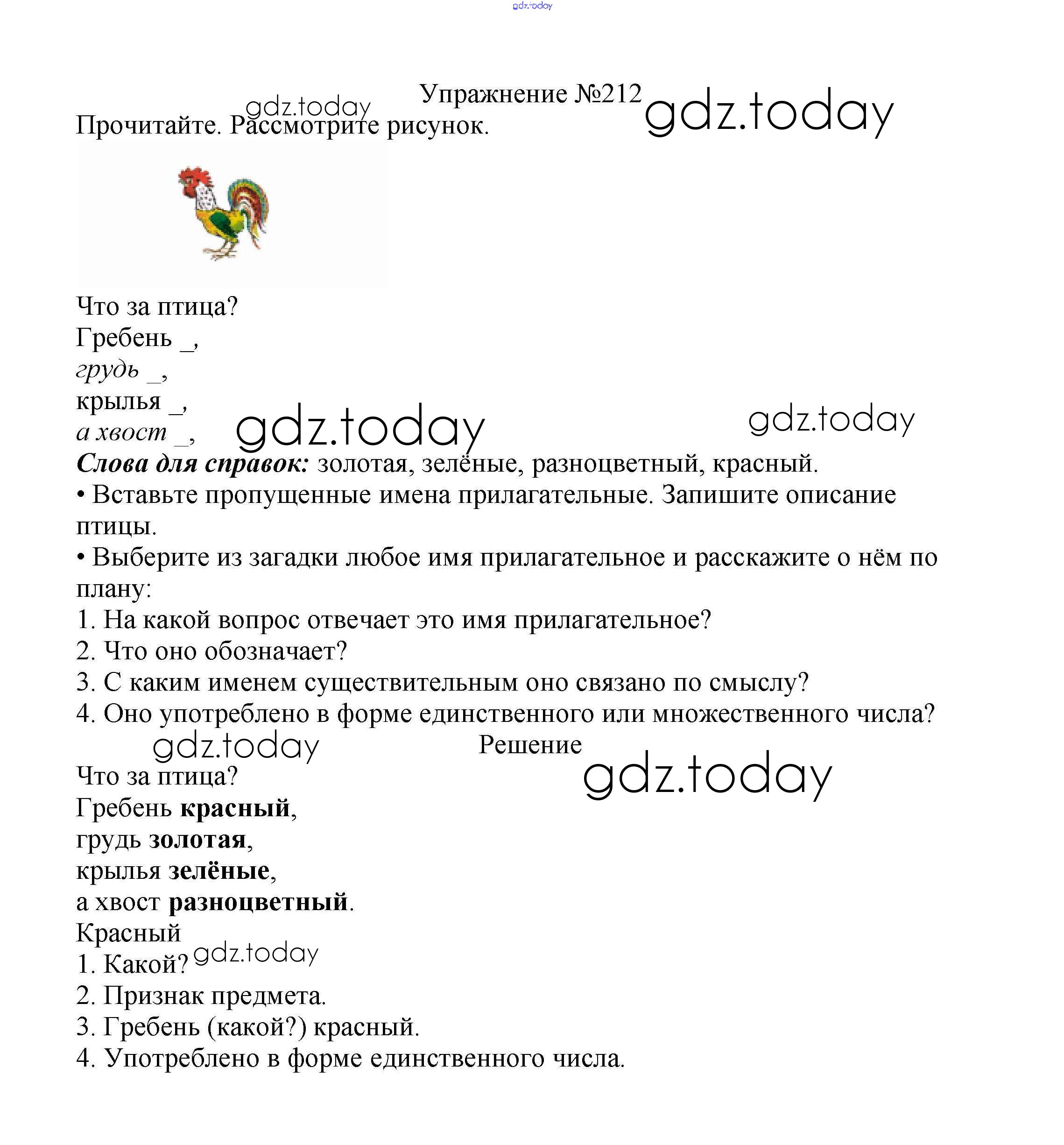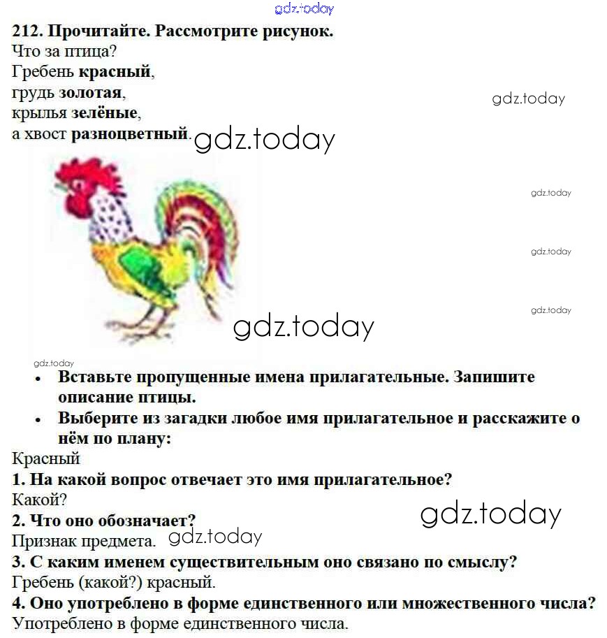 На страницах сайта gdz.today вы найдете учебный и вспомогательный материал, направленный на улучшения знаний школьной программы. ГДЗ - онлайн мир знаний Решение к части №2 (Упражнения) 212 Учебнику по Русскому языку для 2 класса Канакина, Горецкий Просвещение Школа России 2013