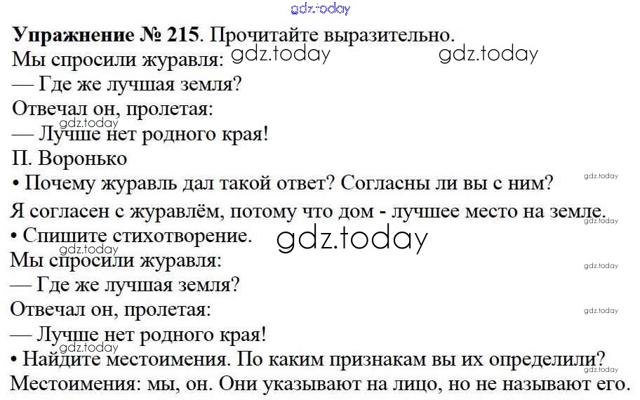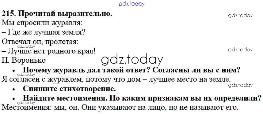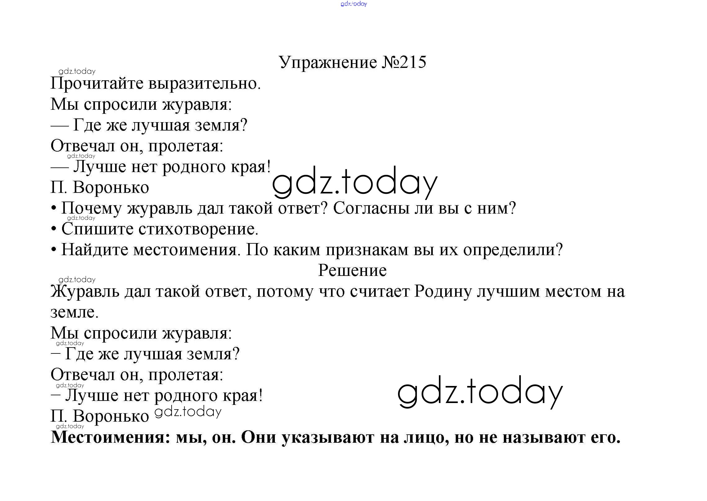 На страницах сайта gdz.today вы найдете учебный и вспомогательный материал, направленный на улучшения знаний школьной программы. ГДЗ - онлайн мир знаний Решение к части №2 (Упражнения) 215 Учебнику по Русскому языку для 2 класса Канакина, Горецкий Просвещение Школа России 2013