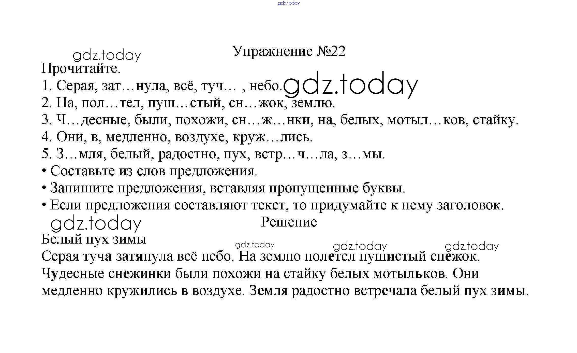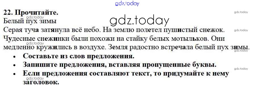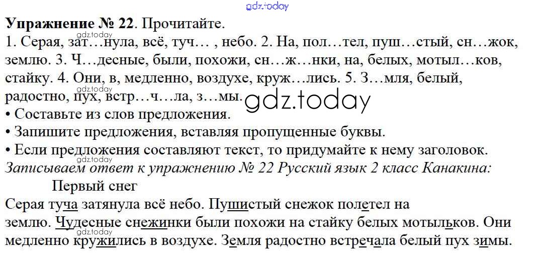 На страницах сайта gdz.today вы найдете учебный и вспомогательный материал, направленный на улучшения знаний школьной программы. ГДЗ - онлайн мир знаний Решение к части №2 (Упражнения) 22 Учебнику по Русскому языку для 2 класса Канакина, Горецкий Просвещение Школа России 2013