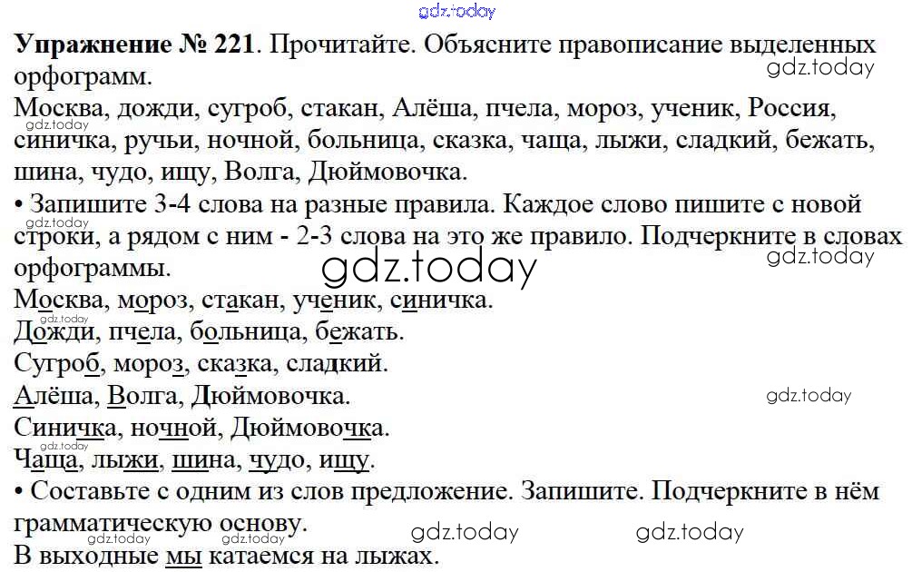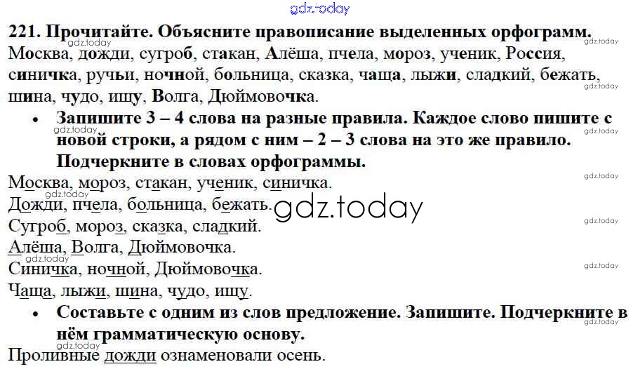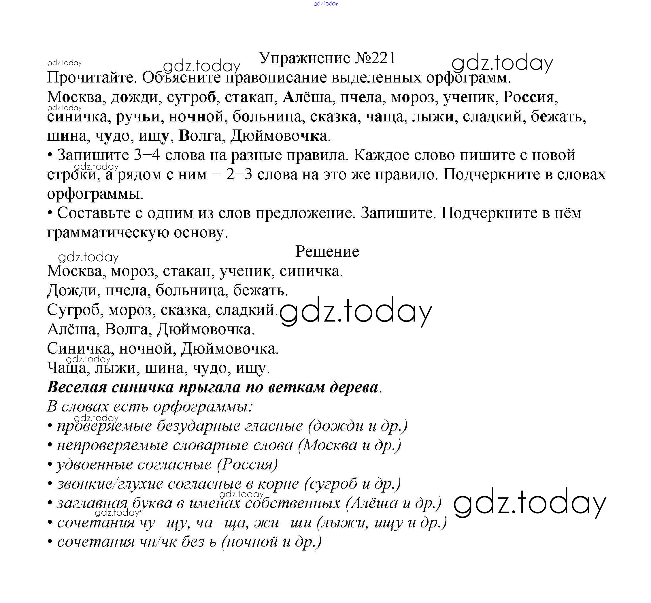 На страницах сайта gdz.today вы найдете учебный и вспомогательный материал, направленный на улучшения знаний школьной программы. ГДЗ - онлайн мир знаний Решение к части №2 (Упражнения) 221 Учебнику по Русскому языку для 2 класса Канакина, Горецкий Просвещение Школа России 2013
