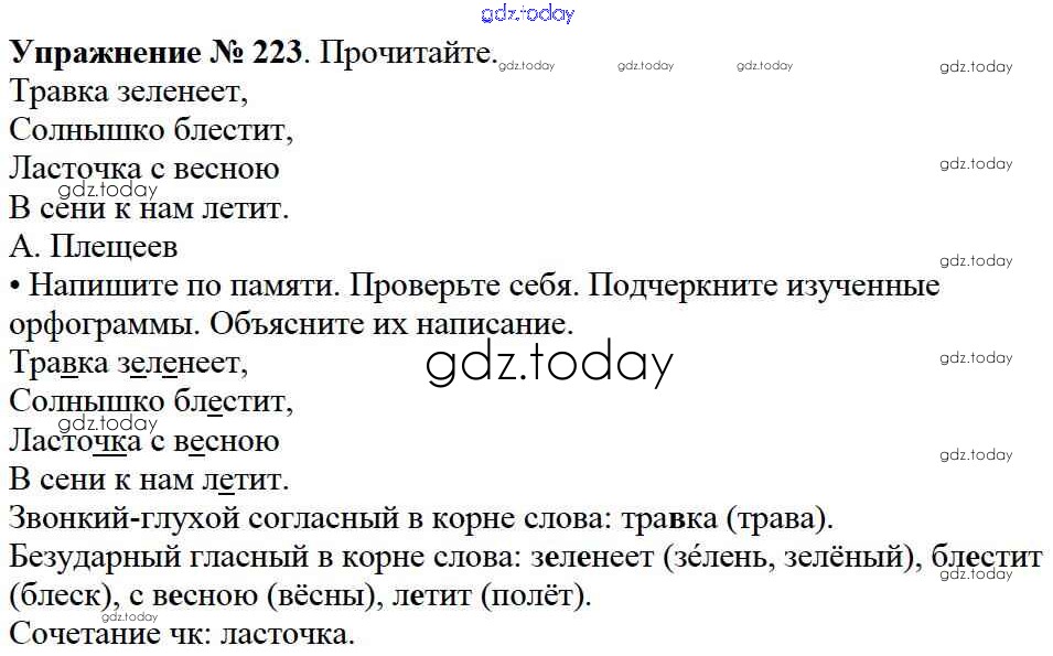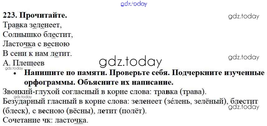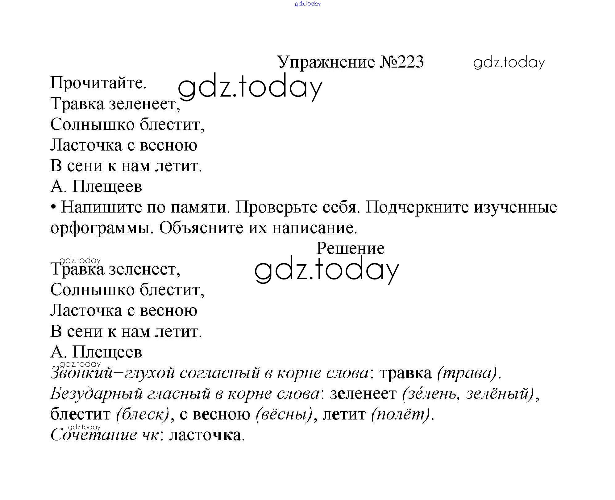 На страницах сайта gdz.today вы найдете учебный и вспомогательный материал, направленный на улучшения знаний школьной программы. ГДЗ - онлайн мир знаний Решение к части №2 (Упражнения) 223 Учебнику по Русскому языку для 2 класса Канакина, Горецкий Просвещение Школа России 2013