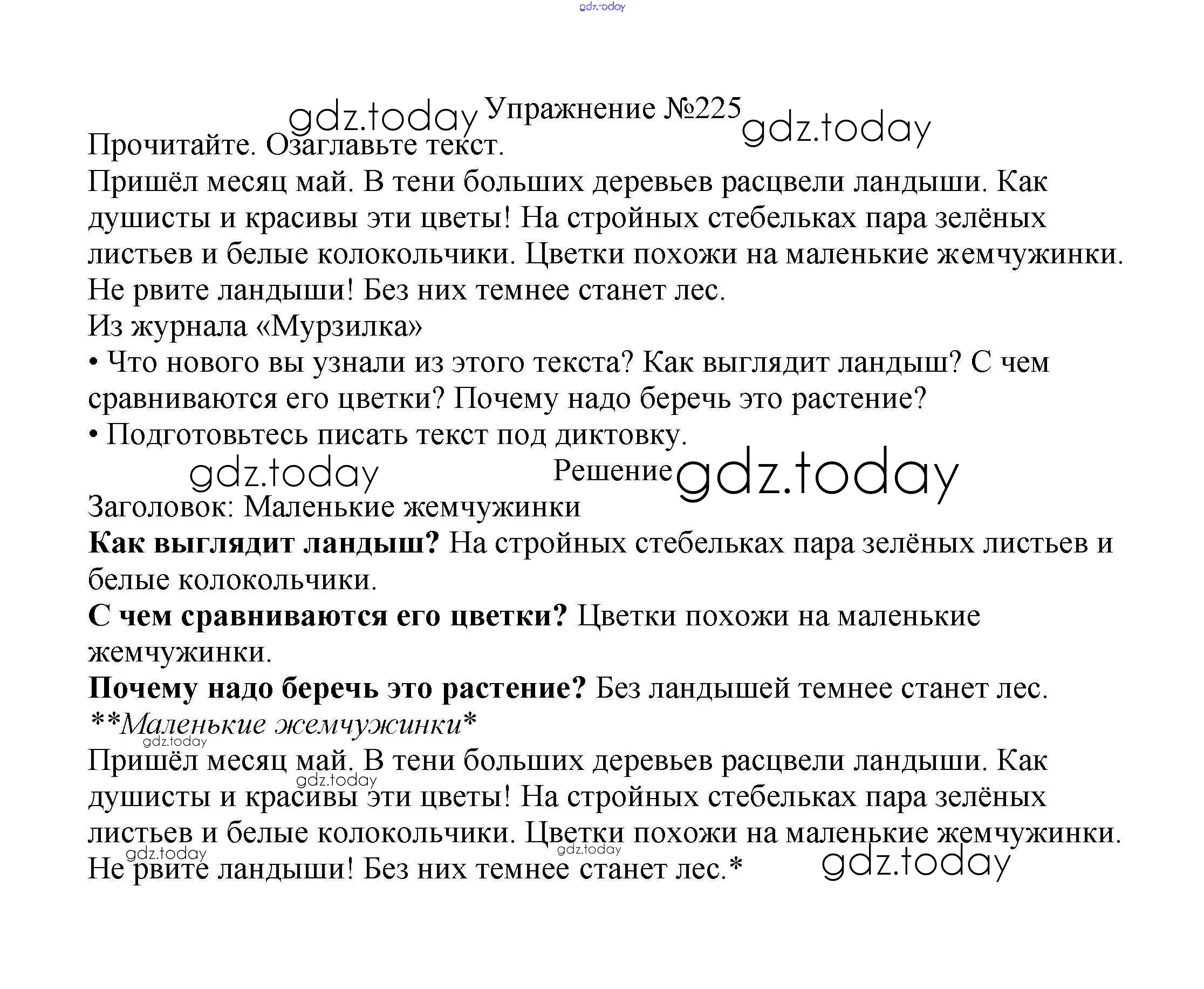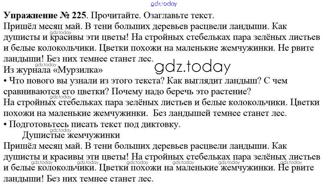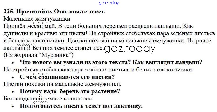На страницах сайта gdz.today вы найдете учебный и вспомогательный материал, направленный на улучшения знаний школьной программы. ГДЗ - онлайн мир знаний Решение к части №2 (Упражнения) 225 Учебнику по Русскому языку для 2 класса Канакина, Горецкий Просвещение Школа России 2013