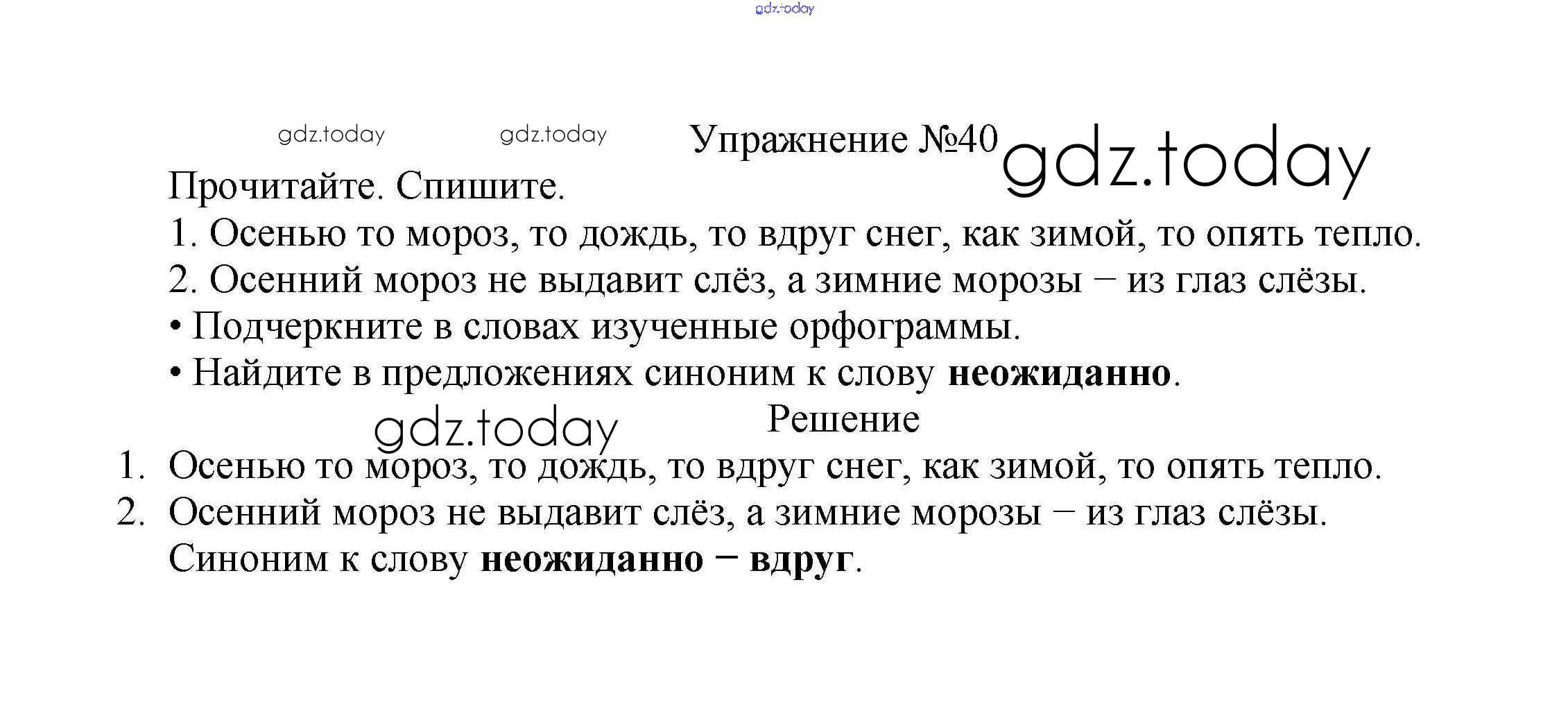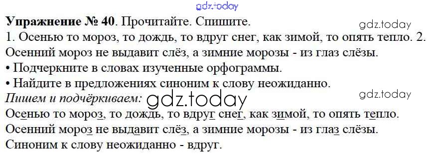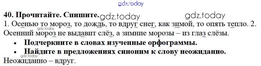 На страницах сайта gdz.today вы найдете учебный и вспомогательный материал, направленный на улучшения знаний школьной программы. ГДЗ - онлайн мир знаний Решение к части №2 (Упражнения) 40 Учебнику по Русскому языку для 2 класса Канакина, Горецкий Просвещение Школа России 2013
