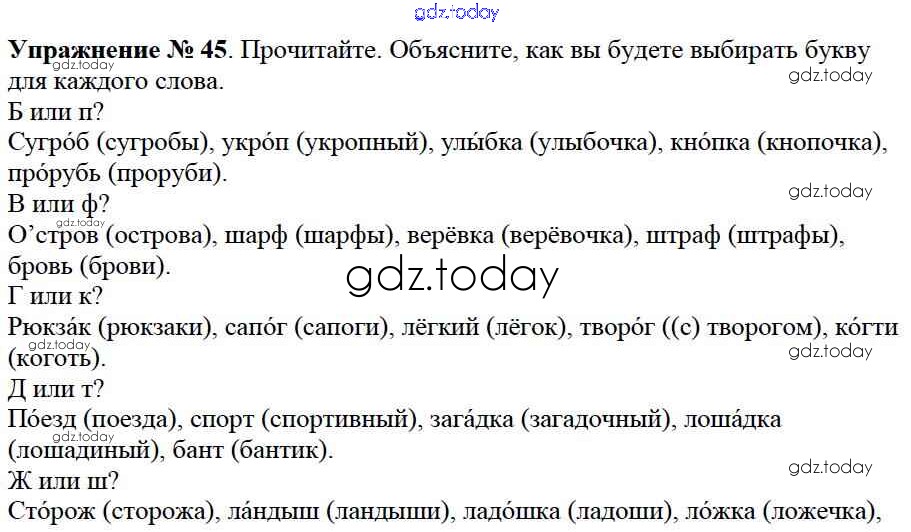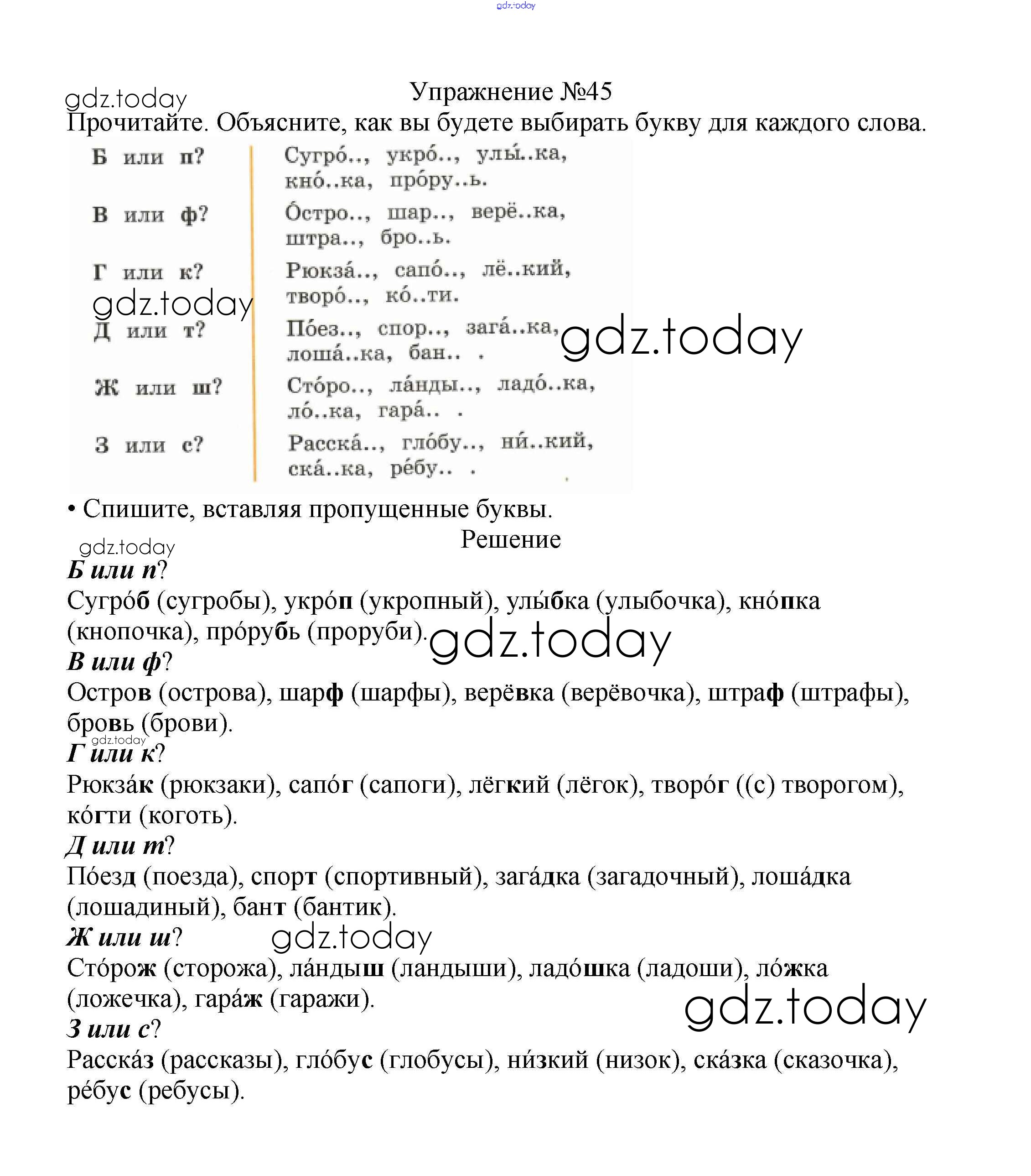 На страницах сайта gdz.today вы найдете учебный и вспомогательный материал, направленный на улучшения знаний школьной программы. ГДЗ - онлайн мир знаний Решение к части №2 (Упражнения) 45 Учебнику по Русскому языку для 2 класса Канакина, Горецкий Просвещение Школа России 2013