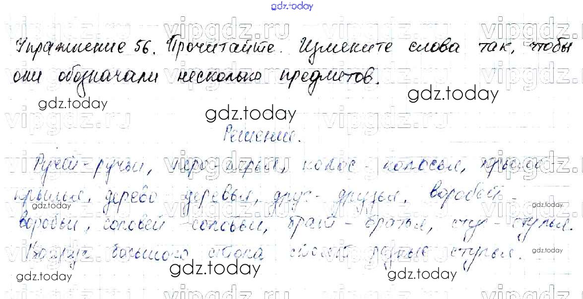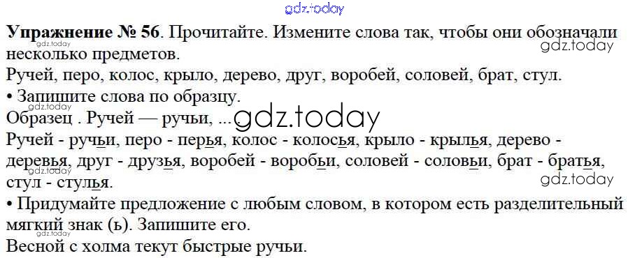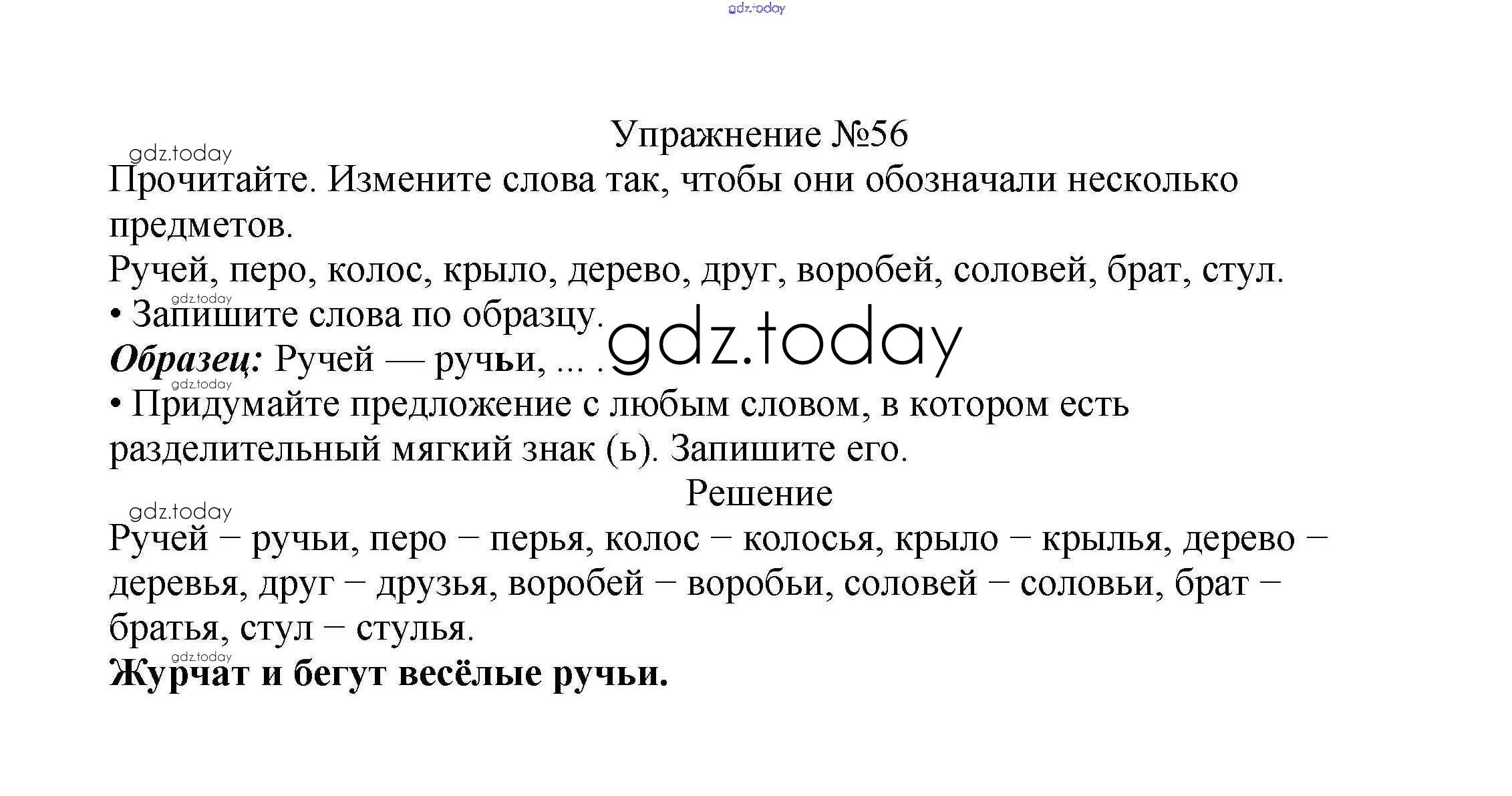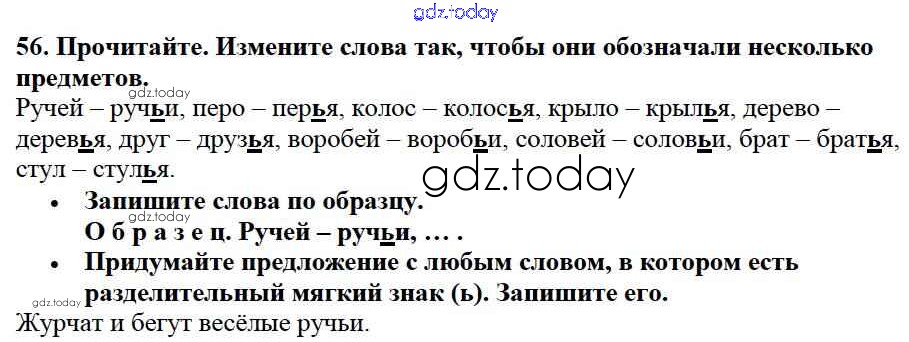 На страницах сайта gdz.today вы найдете учебный и вспомогательный материал, направленный на улучшения знаний школьной программы. ГДЗ - онлайн мир знаний Решение к части №2 (Упражнения) 56 Учебнику по Русскому языку для 2 класса Канакина, Горецкий Просвещение Школа России 2013