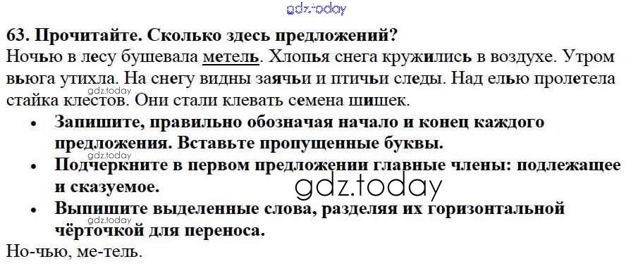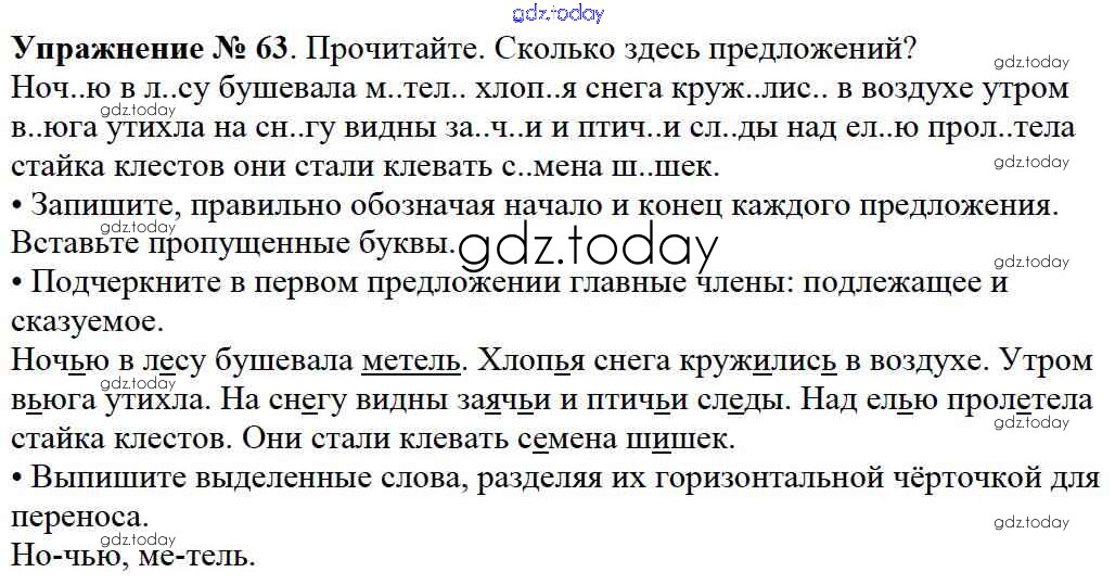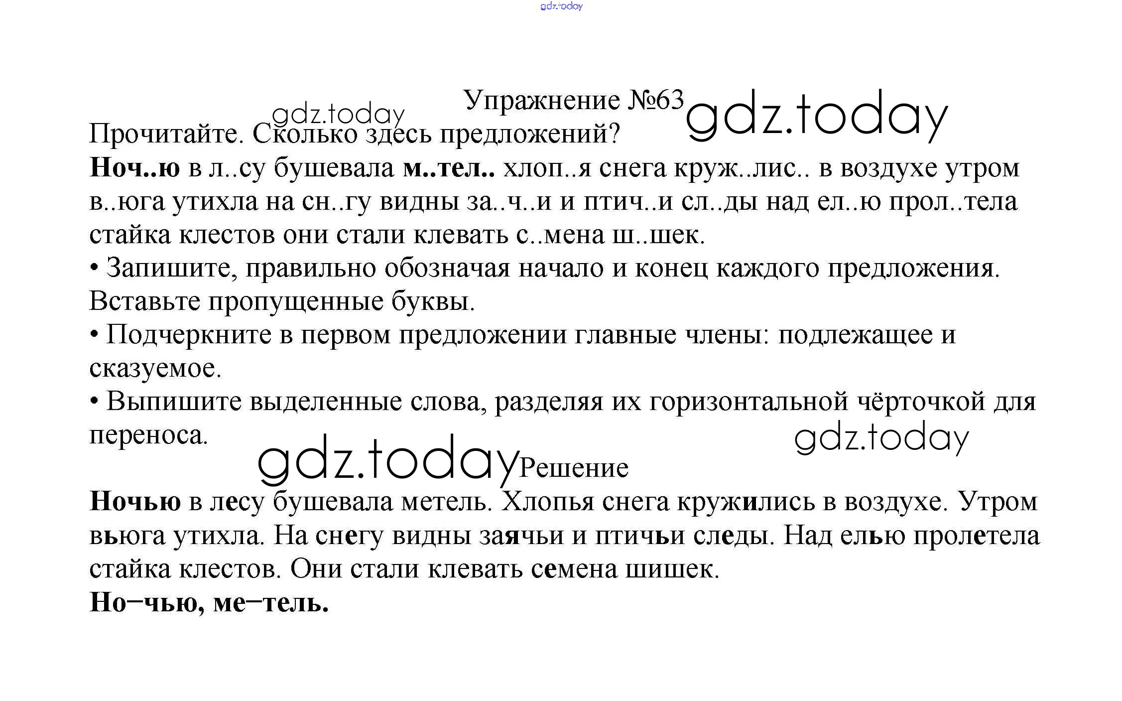 На страницах сайта gdz.today вы найдете учебный и вспомогательный материал, направленный на улучшения знаний школьной программы. ГДЗ - онлайн мир знаний Решение к части №2 (Упражнения) 63 Учебнику по Русскому языку для 2 класса Канакина, Горецкий Просвещение Школа России 2013