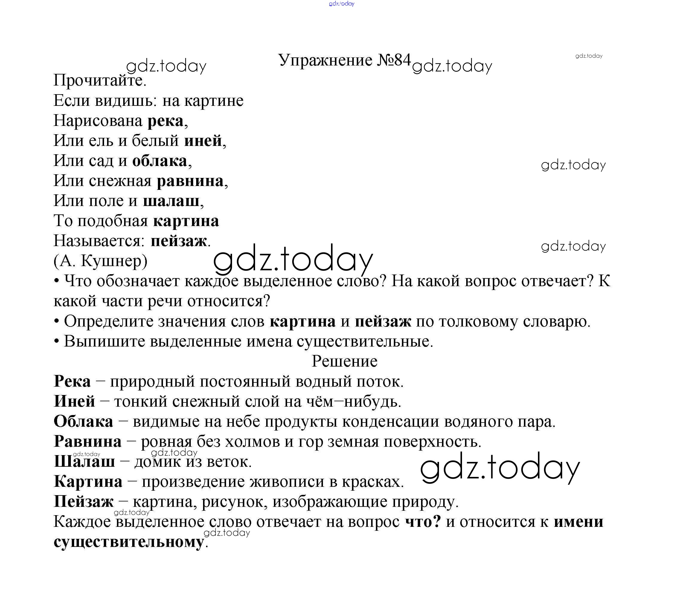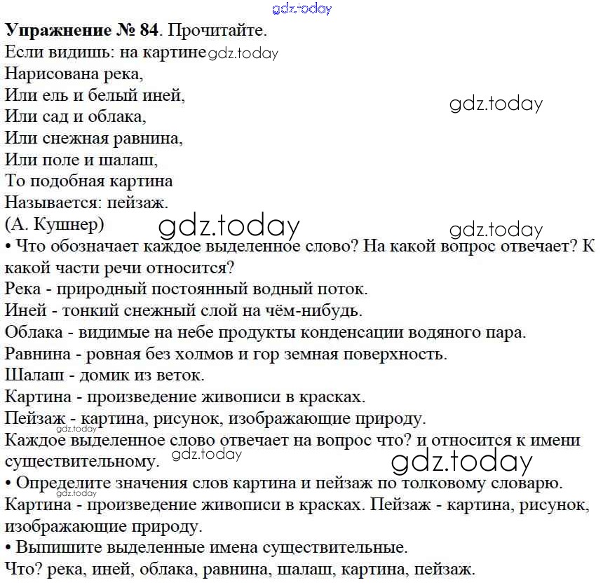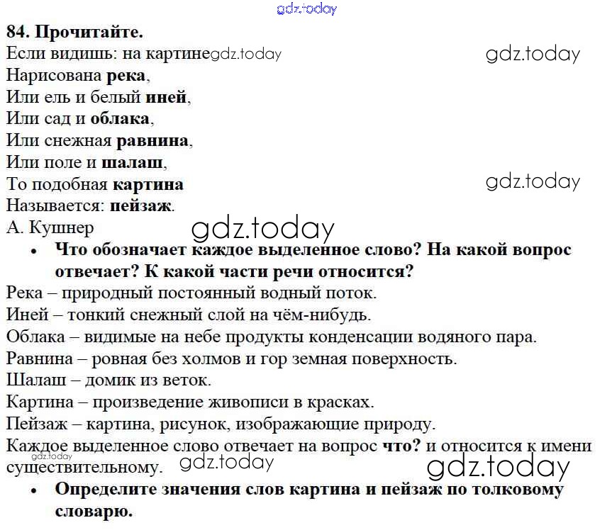 На страницах сайта gdz.today вы найдете учебный и вспомогательный материал, направленный на улучшения знаний школьной программы. ГДЗ - онлайн мир знаний Решение к части №2 (Упражнения) 84 Учебнику по Русскому языку для 2 класса Канакина, Горецкий Просвещение Школа России 2013