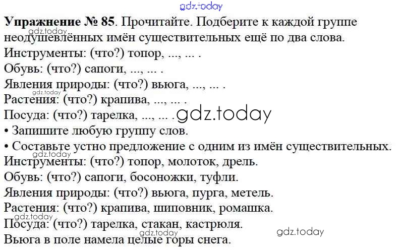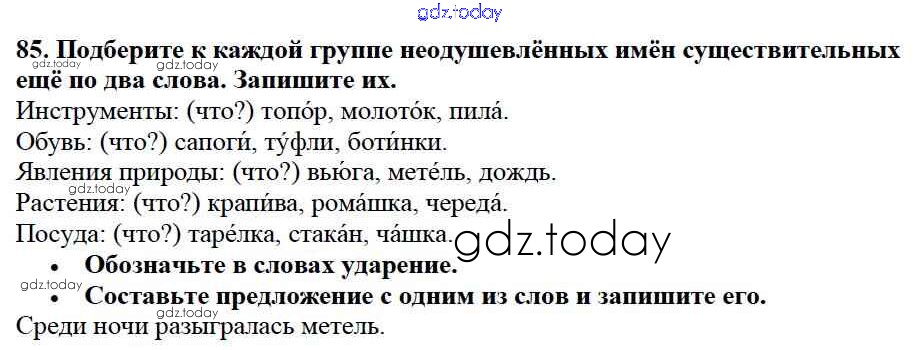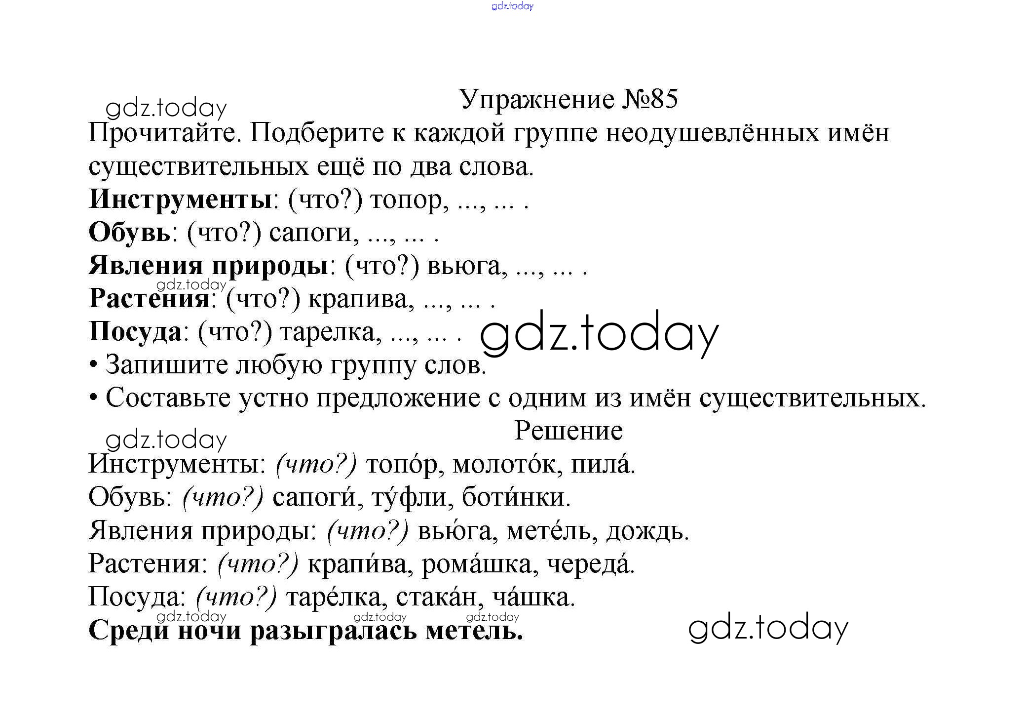 На страницах сайта gdz.today вы найдете учебный и вспомогательный материал, направленный на улучшения знаний школьной программы. ГДЗ - онлайн мир знаний Решение к части №2 (Упражнения) 85 Учебнику по Русскому языку для 2 класса Канакина, Горецкий Просвещение Школа России 2013