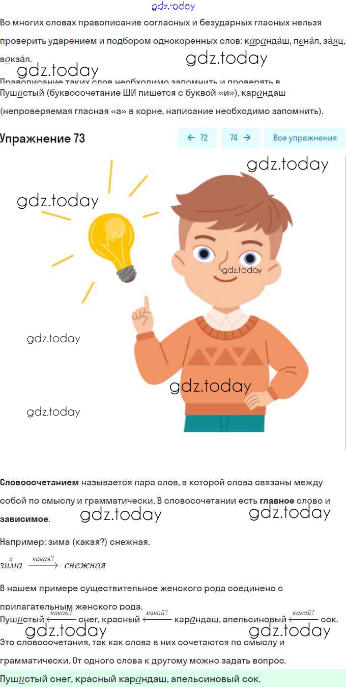 На страницах сайта gdz.today вы найдете учебный и вспомогательный материал, направленный на улучшения знаний школьной программы. ГДЗ - онлайн мир знаний Решение. Упражнения 73 Рабочей тетради по Русскому языку для 2 класса Климанова, Бабушкина Просвещение, Просвещение Перспектива 2016, 2020