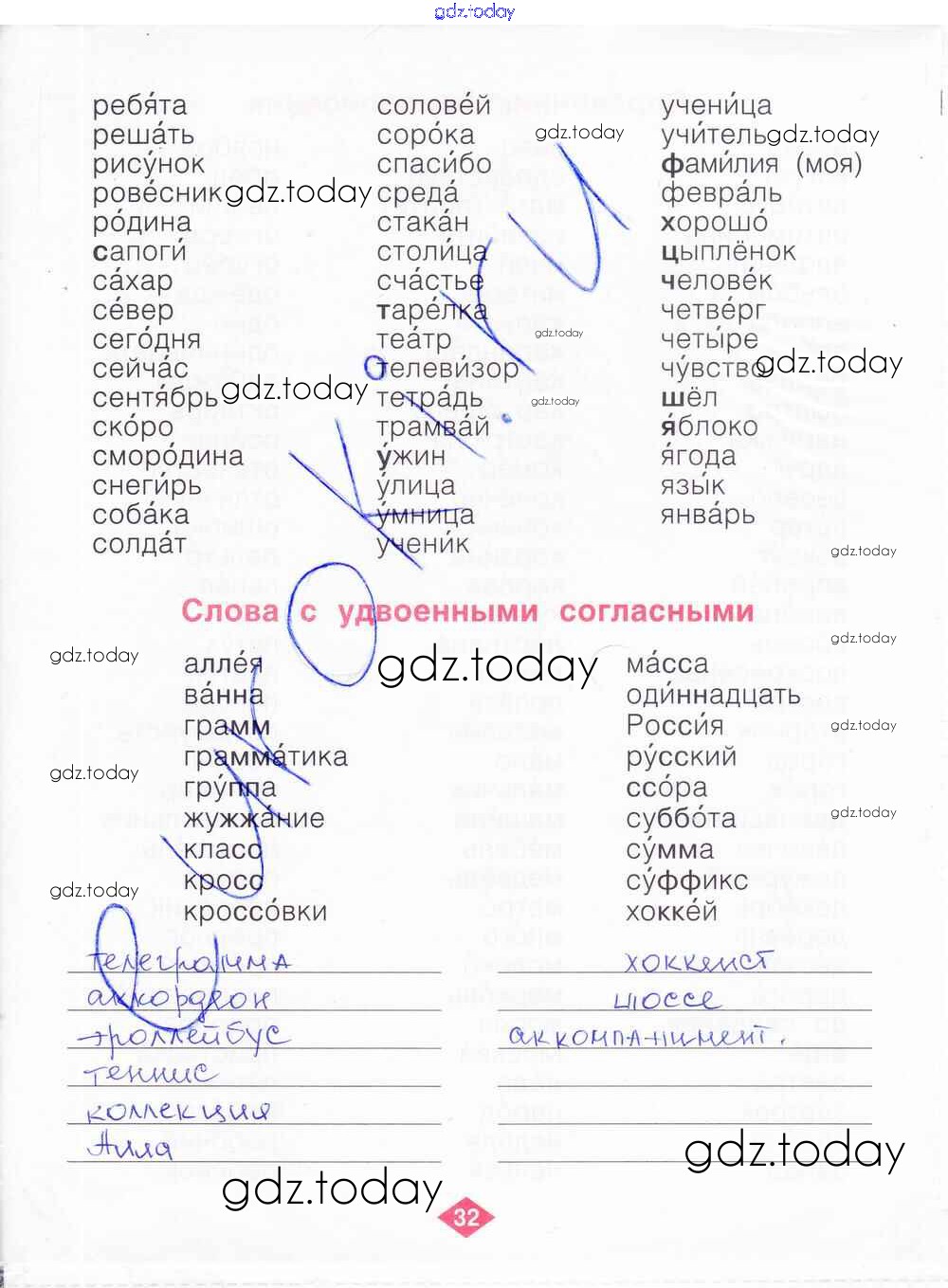 На страницах сайта gdz.today вы найдете учебный и вспомогательный материал, направленный на улучшения знаний школьной программы. ГДЗ - онлайн мир знаний Решение к части 1. Страницы 32 Рабочей тетради по Русскому языку для 2 класса Яковлева Фёдоров 2015