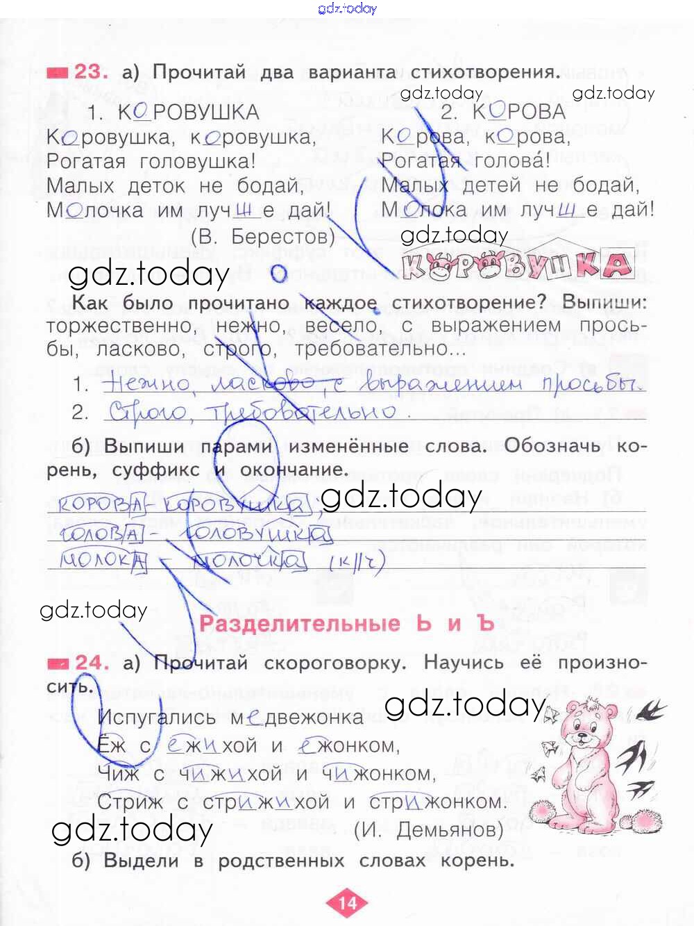 На страницах сайта gdz.today вы найдете учебный и вспомогательный материал, направленный на улучшения знаний школьной программы. ГДЗ - онлайн мир знаний Решение к части 2. Страницы 14 Рабочей тетради по Русскому языку для 2 класса Яковлева Фёдоров 2015
