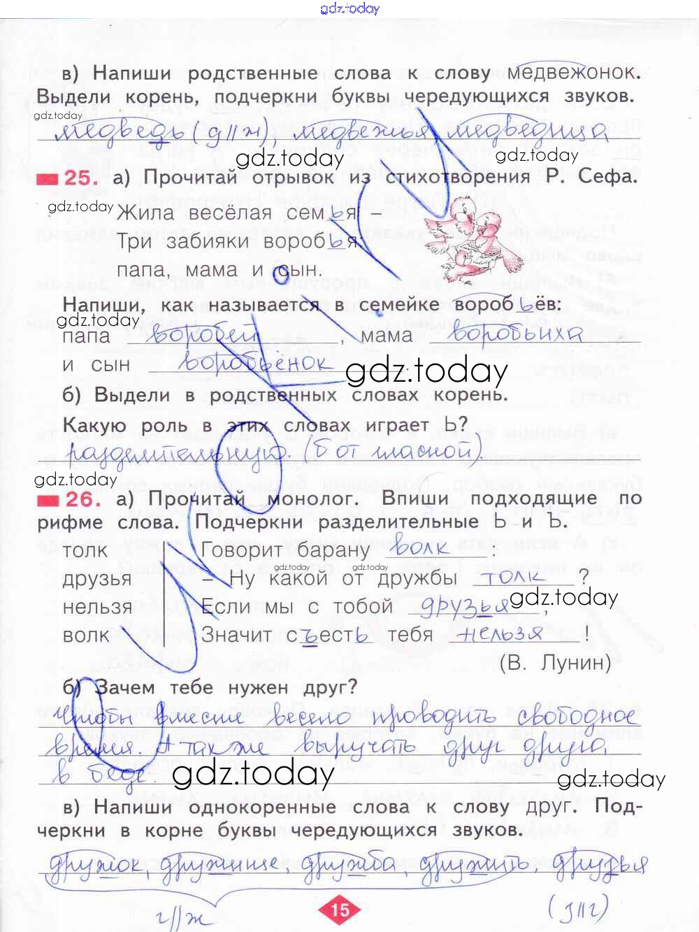 На страницах сайта gdz.today вы найдете учебный и вспомогательный материал, направленный на улучшения знаний школьной программы. ГДЗ - онлайн мир знаний Решение к части 2. Страницы 15 Рабочей тетради по Русскому языку для 2 класса Яковлева Фёдоров 2015