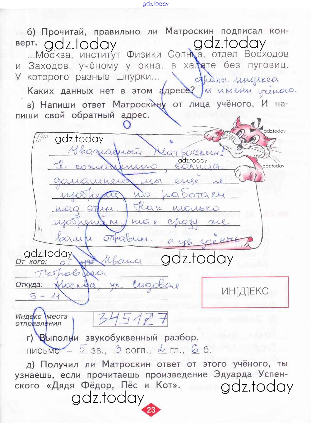 На страницах сайта gdz.today вы найдете учебный и вспомогательный материал, направленный на улучшения знаний школьной программы. ГДЗ - онлайн мир знаний Решение к части 3. Страницы 23 Рабочей тетради по Русскому языку для 2 класса Яковлева Фёдоров 2015