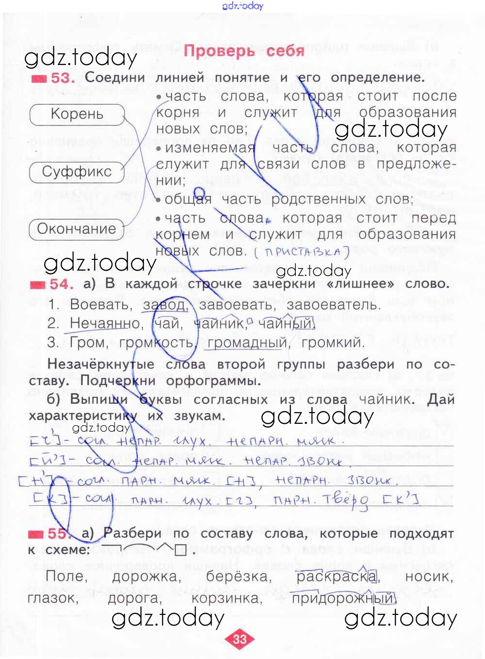 На страницах сайта gdz.today вы найдете учебный и вспомогательный материал, направленный на улучшения знаний школьной программы. ГДЗ - онлайн мир знаний Решение к части 3. Страницы 33 Рабочей тетради по Русскому языку для 2 класса Яковлева Фёдоров 2015