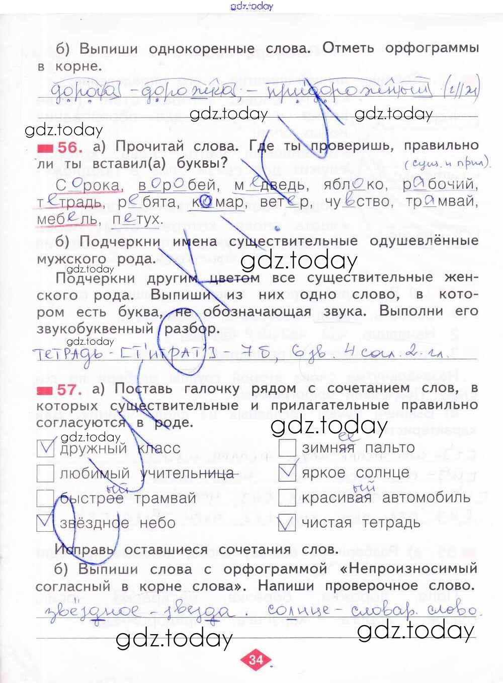 На страницах сайта gdz.today вы найдете учебный и вспомогательный материал, направленный на улучшения знаний школьной программы. ГДЗ - онлайн мир знаний Решение к части 3. Страницы 34 Рабочей тетради по Русскому языку для 2 класса Яковлева Фёдоров 2015