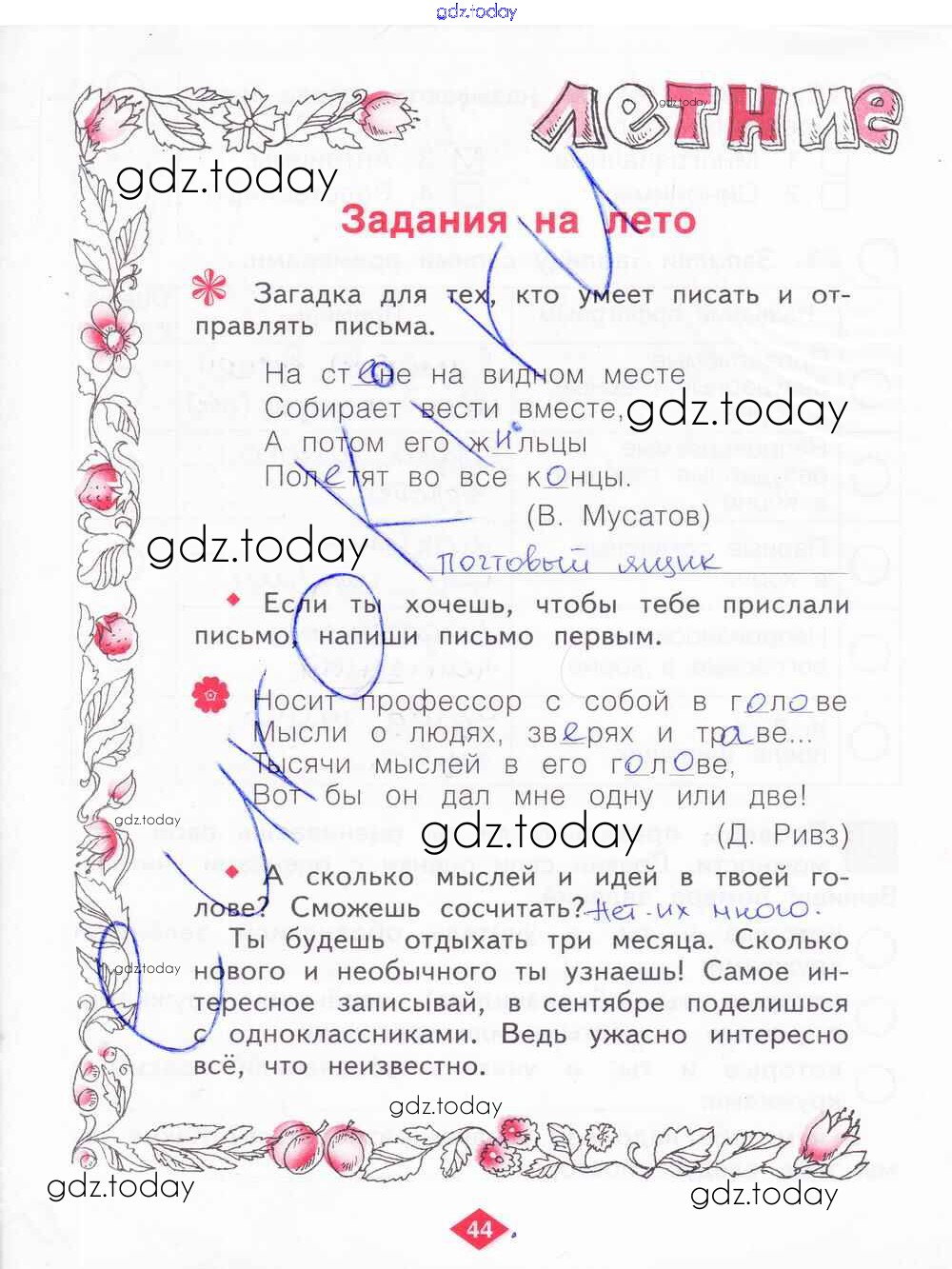 На страницах сайта gdz.today вы найдете учебный и вспомогательный материал, направленный на улучшения знаний школьной программы. ГДЗ - онлайн мир знаний Решение к части 4. Страницы 44 Рабочей тетради по Русскому языку для 2 класса Яковлева Фёдоров 2015