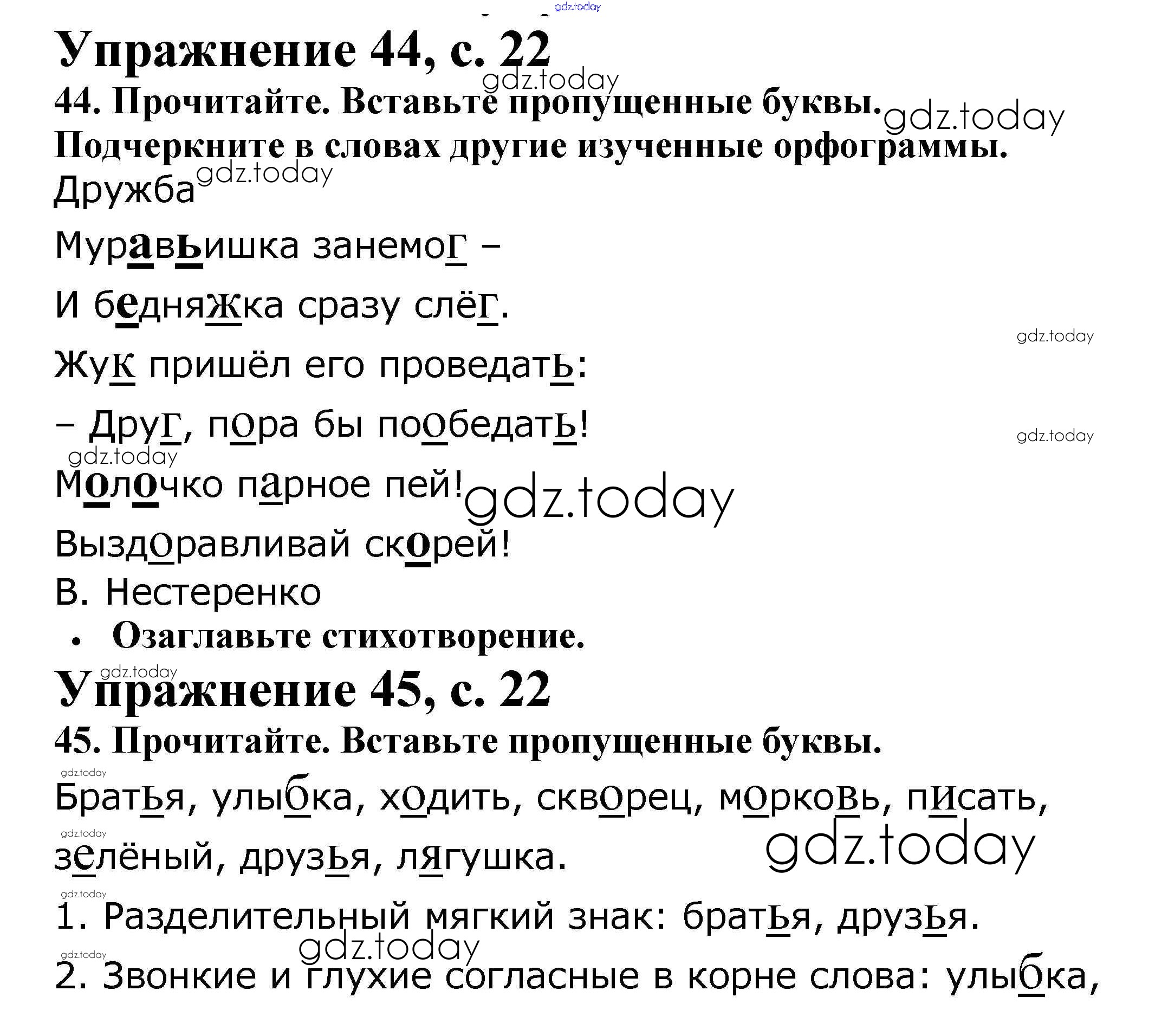 На страницах сайта gdz.today вы найдете учебный и вспомогательный материал, направленный на улучшения знаний школьной программы. ГДЗ - онлайн мир знаний Решение. Часть 2. Страницы 22 Рабочей тетради по Русскому языку для 2 класса Канакина Просвещение Школа России 2012