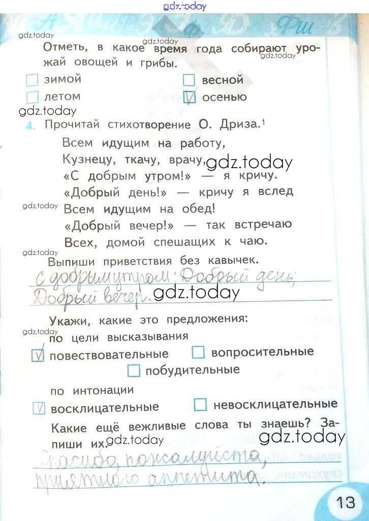 На страницах сайта gdz.today вы найдете учебный и вспомогательный материал, направленный на улучшения знаний школьной программы. ГДЗ - онлайн мир знаний Решение к части 1. Страницы 13 Рабочей тетради по Русскому языку для 2 класса Тихомирова Экзамен УМК 2019