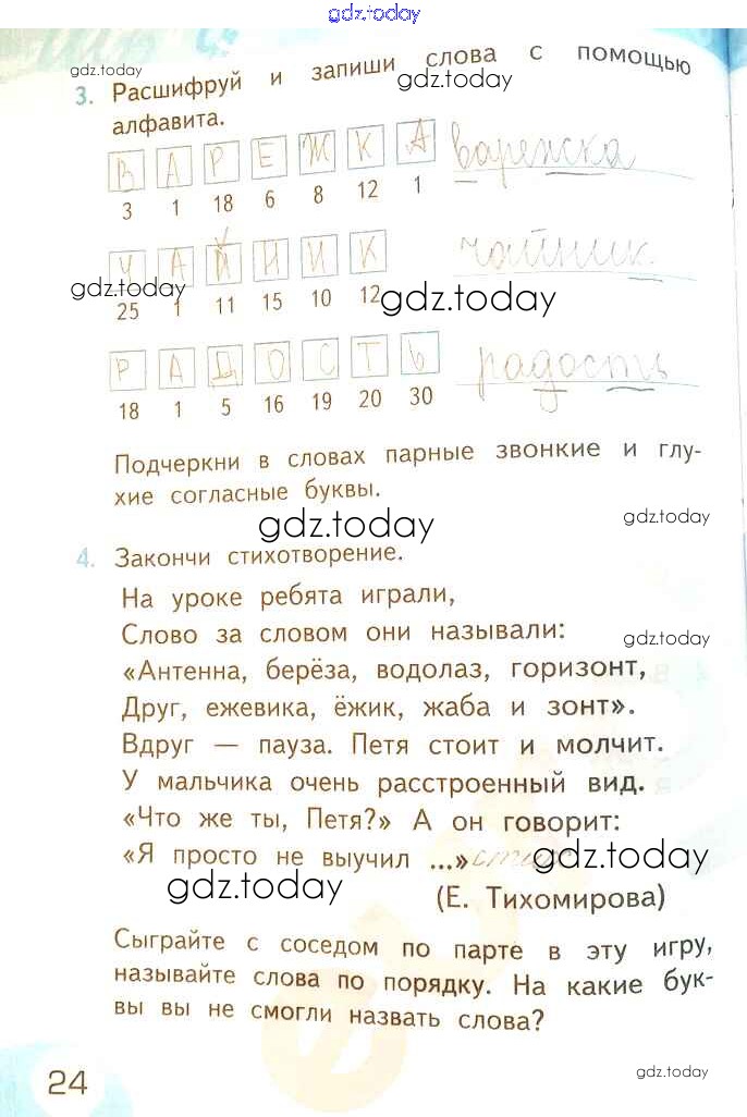 На страницах сайта gdz.today вы найдете учебный и вспомогательный материал, направленный на улучшения знаний школьной программы. ГДЗ - онлайн мир знаний Решение к части 1. Страницы 24 Рабочей тетради по Русскому языку для 2 класса Тихомирова Экзамен УМК 2019