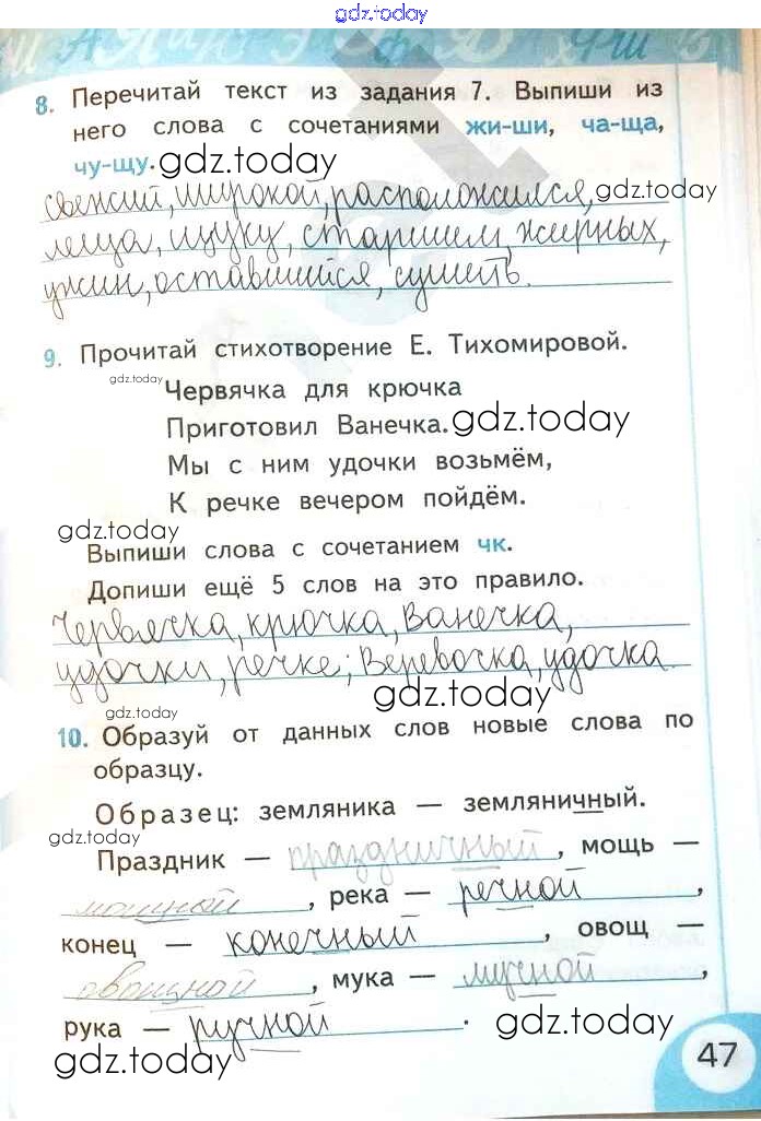 На страницах сайта gdz.today вы найдете учебный и вспомогательный материал, направленный на улучшения знаний школьной программы. ГДЗ - онлайн мир знаний Решение к части 1. Страницы 47 Рабочей тетради по Русскому языку для 2 класса Тихомирова Экзамен УМК 2019
