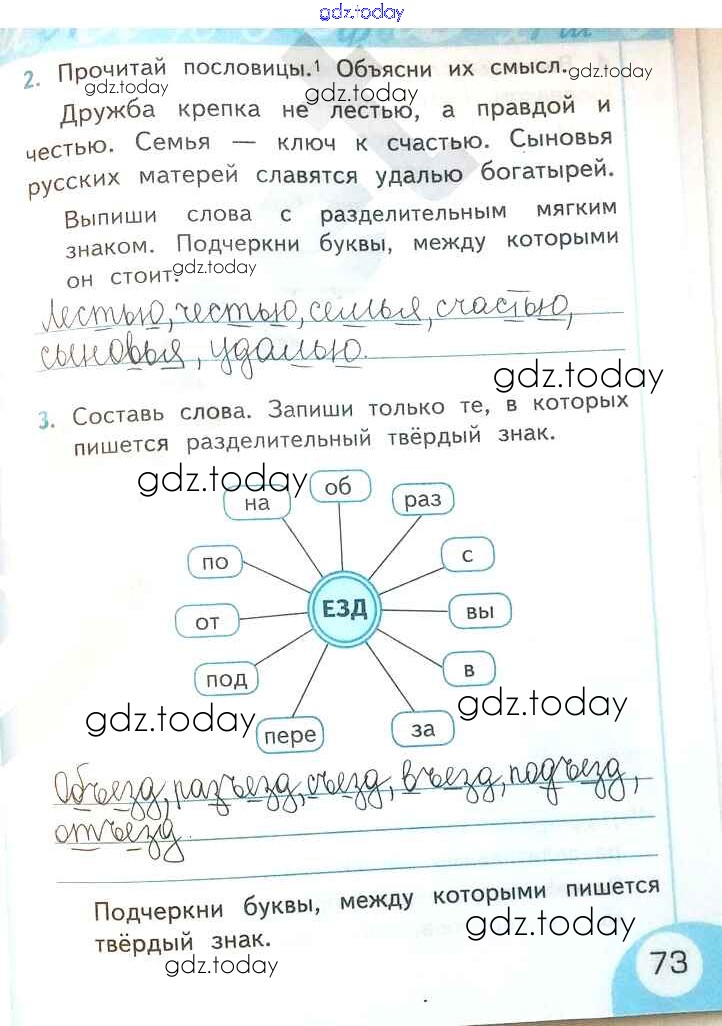 На страницах сайта gdz.today вы найдете учебный и вспомогательный материал, направленный на улучшения знаний школьной программы. ГДЗ - онлайн мир знаний Решение к части 1. Страницы 73 Рабочей тетради по Русскому языку для 2 класса Тихомирова Экзамен УМК 2019