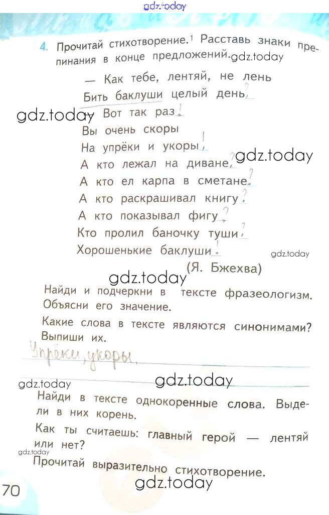 На страницах сайта gdz.today вы найдете учебный и вспомогательный материал, направленный на улучшения знаний школьной программы. ГДЗ - онлайн мир знаний Решение к части 2. Страницы 70 Рабочей тетради по Русскому языку для 2 класса Тихомирова Экзамен УМК 2019