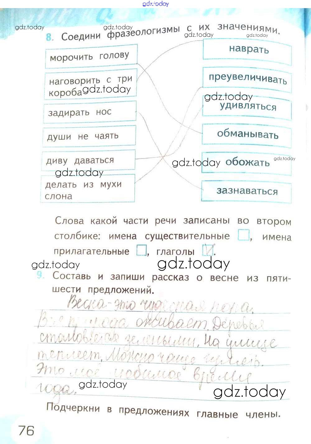На страницах сайта gdz.today вы найдете учебный и вспомогательный материал, направленный на улучшения знаний школьной программы. ГДЗ - онлайн мир знаний Решение к части 2. Страницы 76 Рабочей тетради по Русскому языку для 2 класса Тихомирова Экзамен УМК 2019