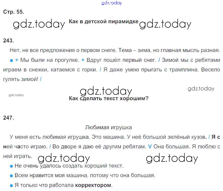 На страницах сайта gdz.today вы найдете учебный и вспомогательный материал, направленный на улучшения знаний школьной программы. ГДЗ - онлайн мир знаний Решение к части 1. Страницы 55 Рабочей тетради по Русскому языку для 2 класса Соловейчик, Кузьменко Ассоциация 21 век Гармония 2012