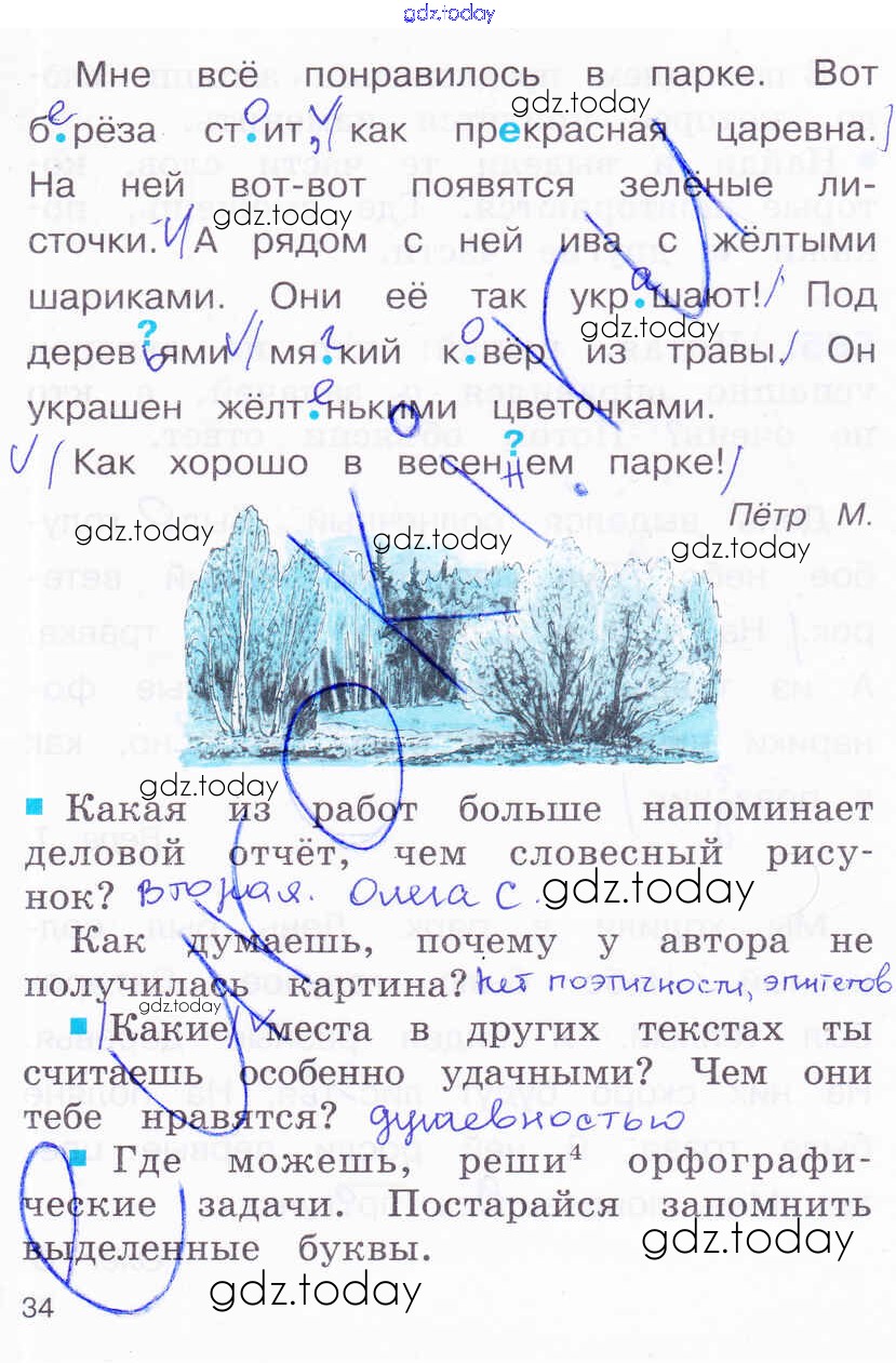 На страницах сайта gdz.today вы найдете учебный и вспомогательный материал, направленный на улучшения знаний школьной программы. ГДЗ - онлайн мир знаний Решение к части 3. Страницы 34 Рабочей тетради по Русскому языку для 2 класса Соловейчик, Кузьменко Ассоциация 21 век Гармония 2012