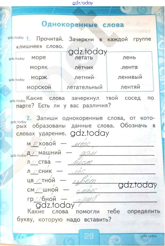На страницах сайта gdz.today вы найдете учебный и вспомогательный материал, направленный на улучшения знаний школьной программы. ГДЗ - онлайн мир знаний Решение к части 1. Страницы 29 Рабочей тетради по Русскому языку для 2 класса Тихомирова Экзамен УМК 2018