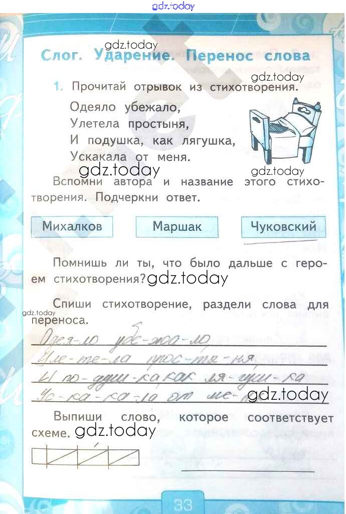 На страницах сайта gdz.today вы найдете учебный и вспомогательный материал, направленный на улучшения знаний школьной программы. ГДЗ - онлайн мир знаний Решение к части 1. Страницы 33 Рабочей тетради по Русскому языку для 2 класса Тихомирова Экзамен УМК 2018