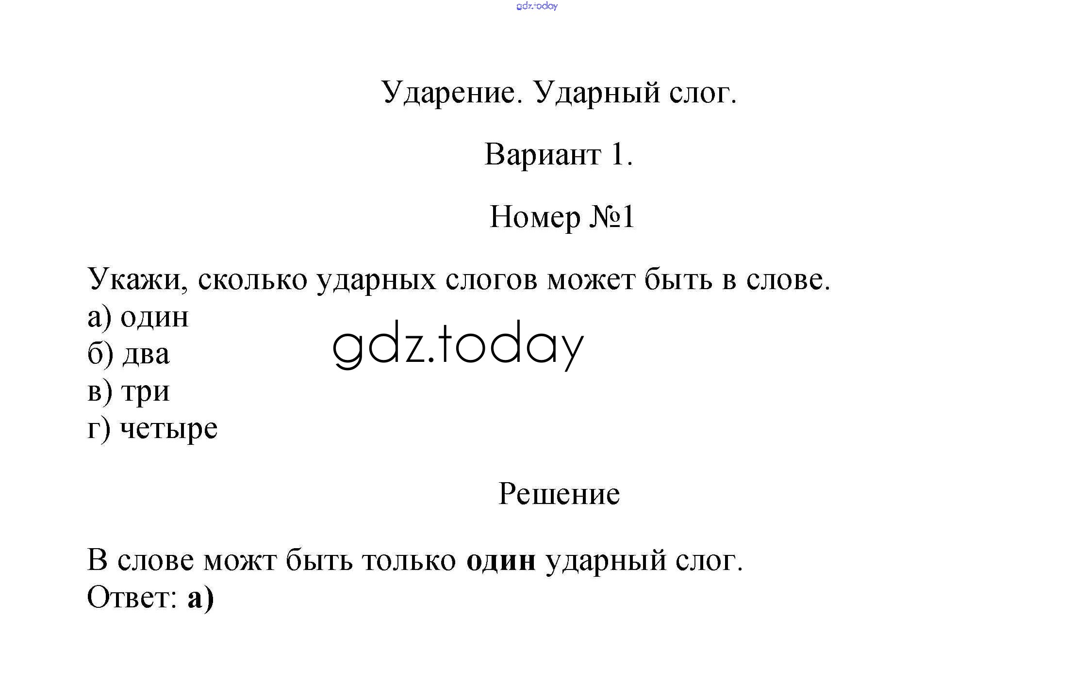 На страницах сайта gdz.today вы найдете учебный и вспомогательный материал, направленный на улучшения знаний школьной программы. ГДЗ - онлайн мир знаний Вариант 1 Решение к тесту 8. Ударение. Ударный слог 1 Тестам по Русскому языку для 2 класса Тихомирова Экзамен УМК 2020