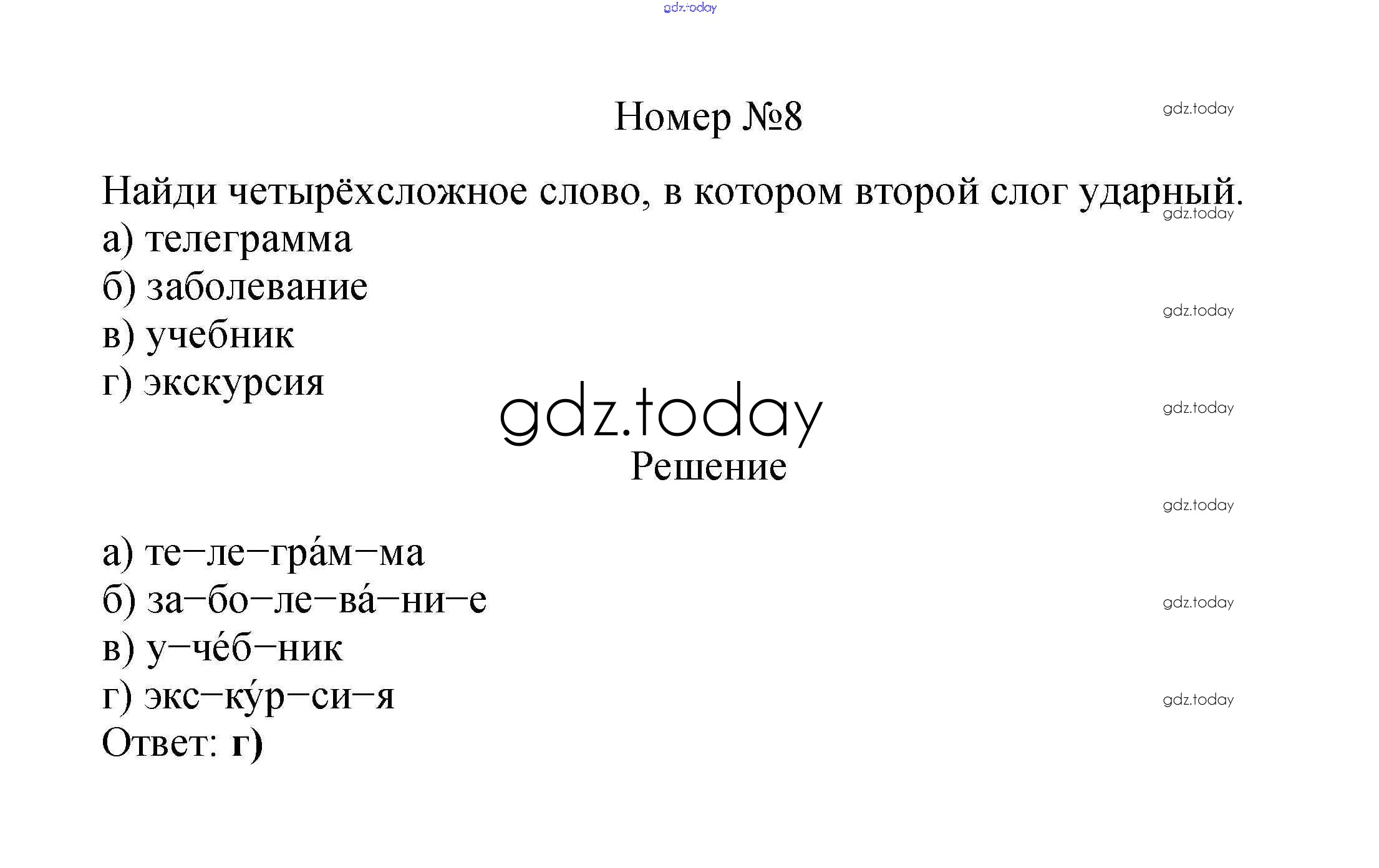 На страницах сайта gdz.today вы найдете учебный и вспомогательный материал, направленный на улучшения знаний школьной программы. ГДЗ - онлайн мир знаний Вариант 1 Решение к тесту 8. Ударение. Ударный слог 8 Тестам по Русскому языку для 2 класса Тихомирова Экзамен УМК 2020