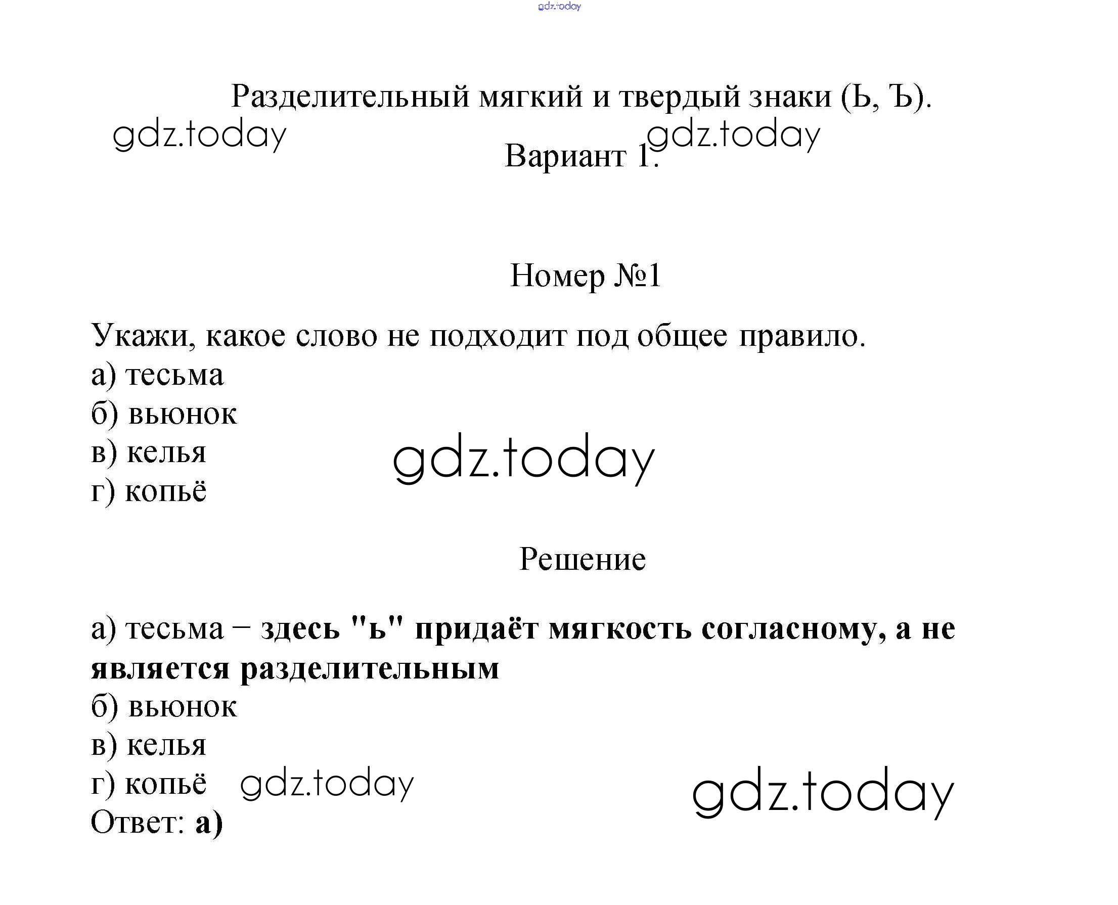 На страницах сайта gdz.today вы найдете учебный и вспомогательный материал, направленный на улучшения знаний школьной программы. ГДЗ - онлайн мир знаний Вариант 1 Решение к тесту 13. Разделительный мягкий и твердый знаки (Ь, Ъ) 1 Тестам по Русскому языку для 2 класса Тихомирова Экзамен УМК 2020