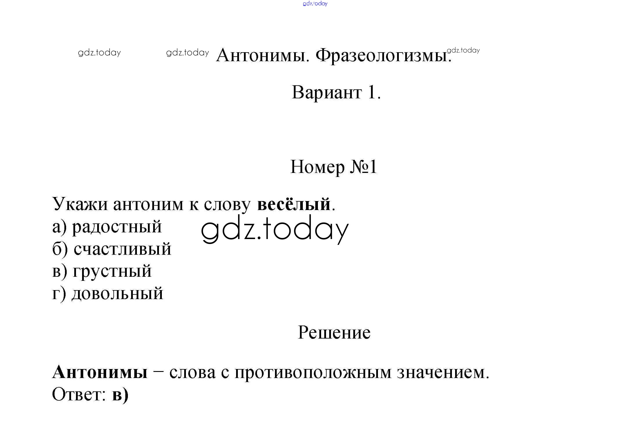 На страницах сайта gdz.today вы найдете учебный и вспомогательный материал, направленный на улучшения знаний школьной программы. ГДЗ - онлайн мир знаний Вариант 1 Решение к тесту 17. Слова противоположные по значению (антонимы). Устойчивые сочетания слов (фразеологизимы) 1 Тестам по Русскому языку для 2 класса Тихомирова Экзамен УМК 2020