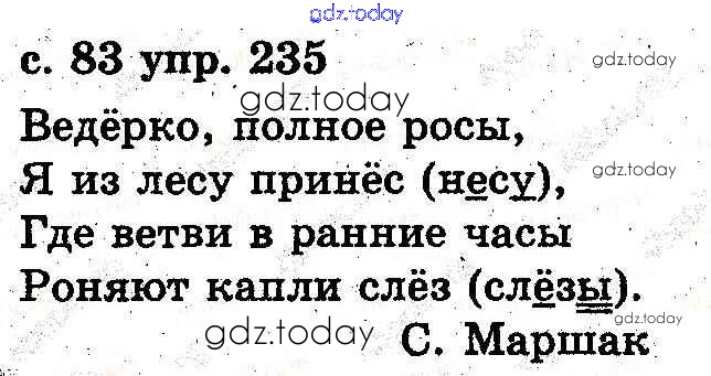 На страницах сайта gdz.today вы найдете учебный и вспомогательный материал, направленный на улучшения знаний школьной программы. ГДЗ - онлайн мир знаний Решение к разделу: Звуки и буквы 235 Учебнику по Русскому языку для 2 класса Каневская, Олейник Генеза 2012