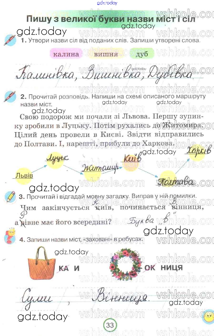 Ответы к Рішення до Сторінки 33 Рабочей тетради по Украинскому языку для 2 класса Пономарева Орiон 2019