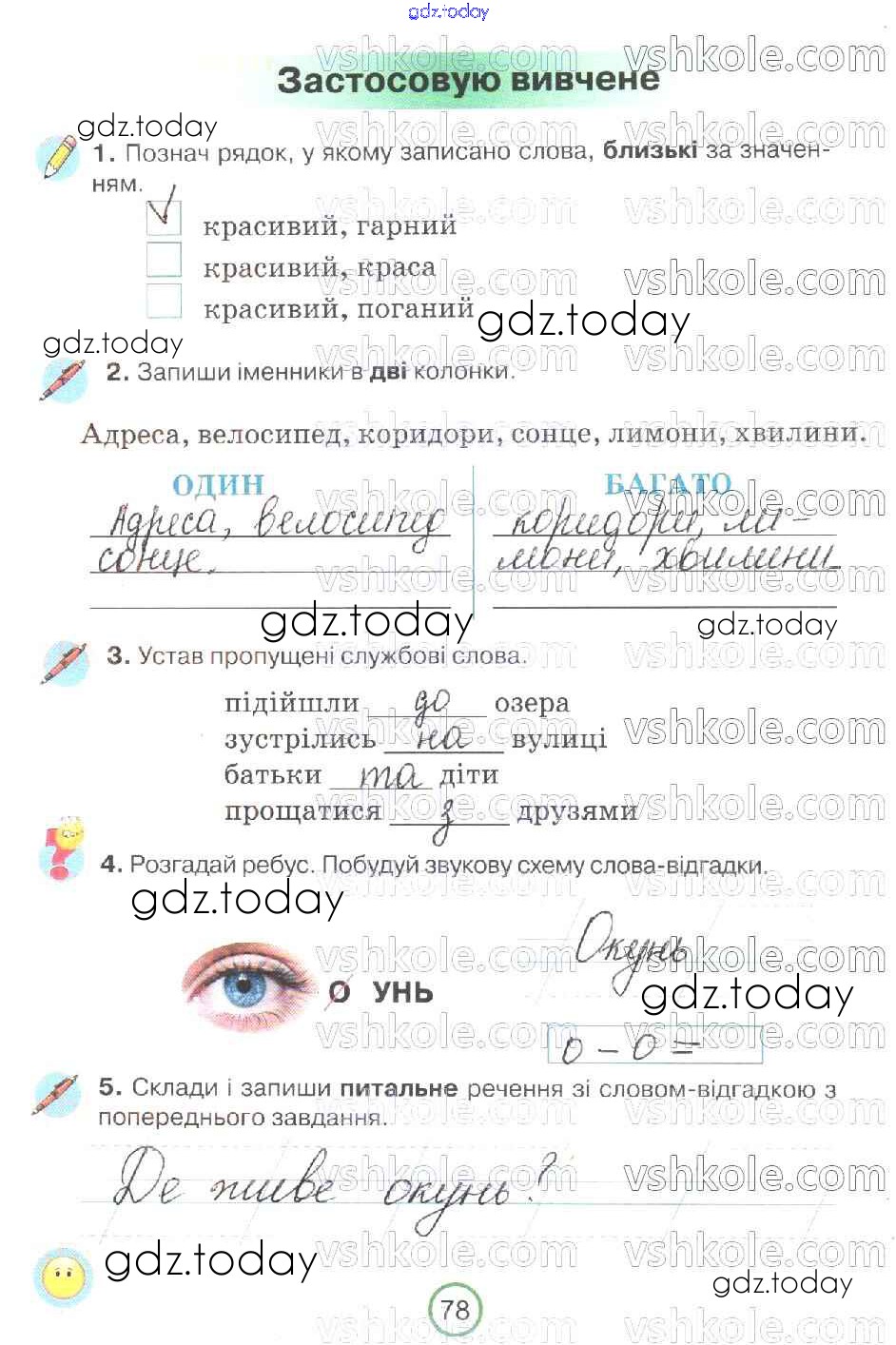 На страницах сайта gdz.today вы найдете учебный и вспомогательный материал, направленный на улучшения знаний школьной программы. ГДЗ - онлайн мир знаний Рішення до Сторінки 78 Рабочей тетради по Украинскому языку для 2 класса Пономарева Орiон 2019
