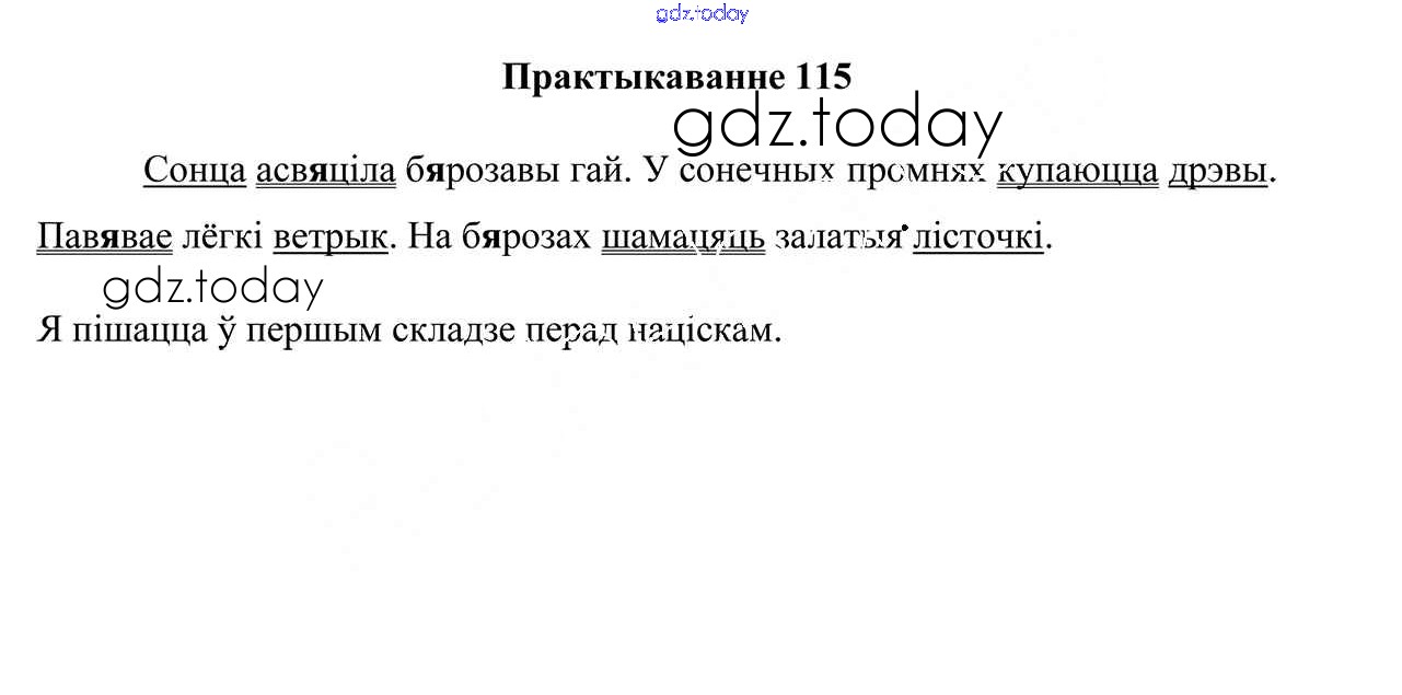 На страницах сайта gdz.today вы найдете учебный и вспомогательный материал, направленный на улучшения знаний школьной программы. ГДЗ - онлайн мир знаний Рашальнік да часткі 1. Практыкаванні 115 Учебнику по Белорусскому языку для 3 класса Свірыдзенка Национальный институт образования 2017