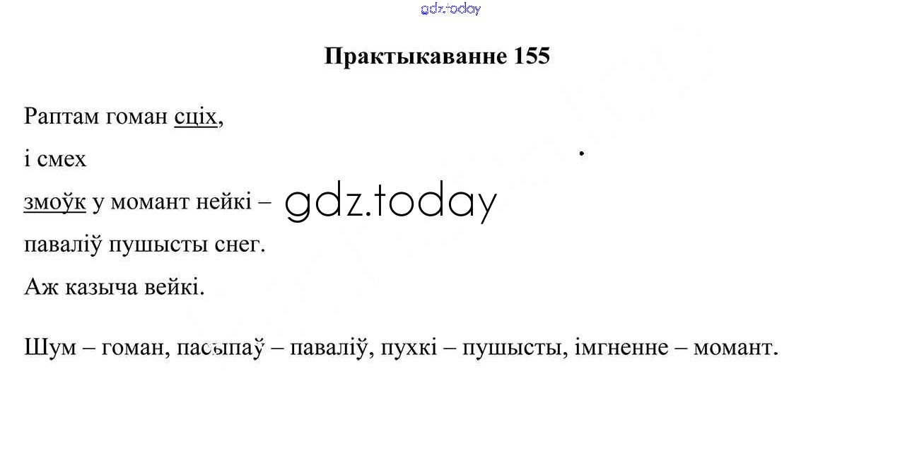 На страницах сайта gdz.today вы найдете учебный и вспомогательный материал, направленный на улучшения знаний школьной программы. ГДЗ - онлайн мир знаний Рашальнік да часткі 1. Практыкаванні 155 Учебнику по Белорусскому языку для 3 класса Свірыдзенка Национальный институт образования 2017