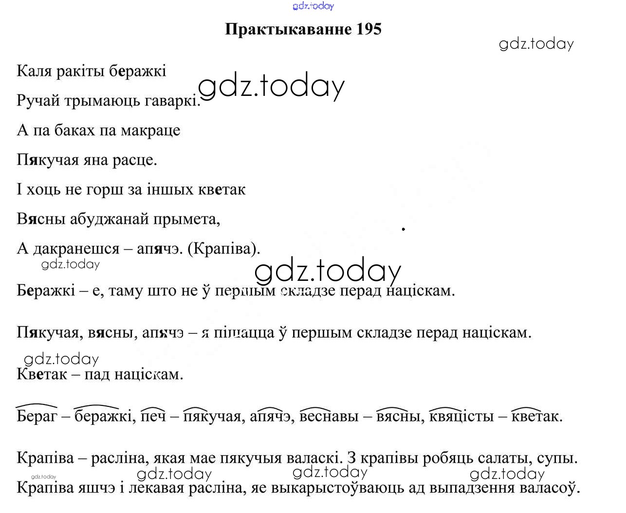 На страницах сайта gdz.today вы найдете учебный и вспомогательный материал, направленный на улучшения знаний школьной программы. ГДЗ - онлайн мир знаний Рашальнік да часткі 1. Практыкаванні 195 Учебнику по Белорусскому языку для 3 класса Свірыдзенка Национальный институт образования 2017