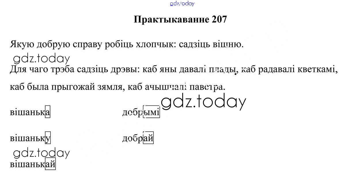 На страницах сайта gdz.today вы найдете учебный и вспомогательный материал, направленный на улучшения знаний школьной программы. ГДЗ - онлайн мир знаний Рашальнік да часткі 1. Практыкаванні 207 Учебнику по Белорусскому языку для 3 класса Свірыдзенка Национальный институт образования 2017