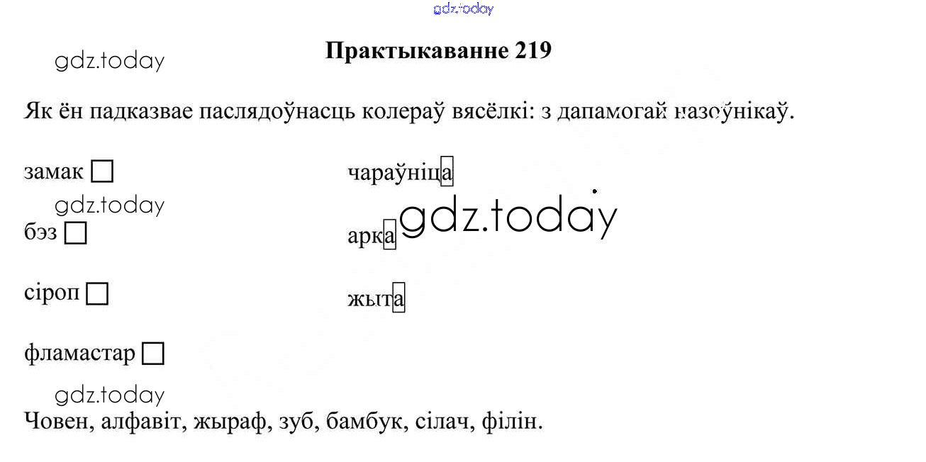 На страницах сайта gdz.today вы найдете учебный и вспомогательный материал, направленный на улучшения знаний школьной программы. ГДЗ - онлайн мир знаний Рашальнік да часткі 1. Практыкаванні 219 Учебнику по Белорусскому языку для 3 класса Свірыдзенка Национальный институт образования 2017