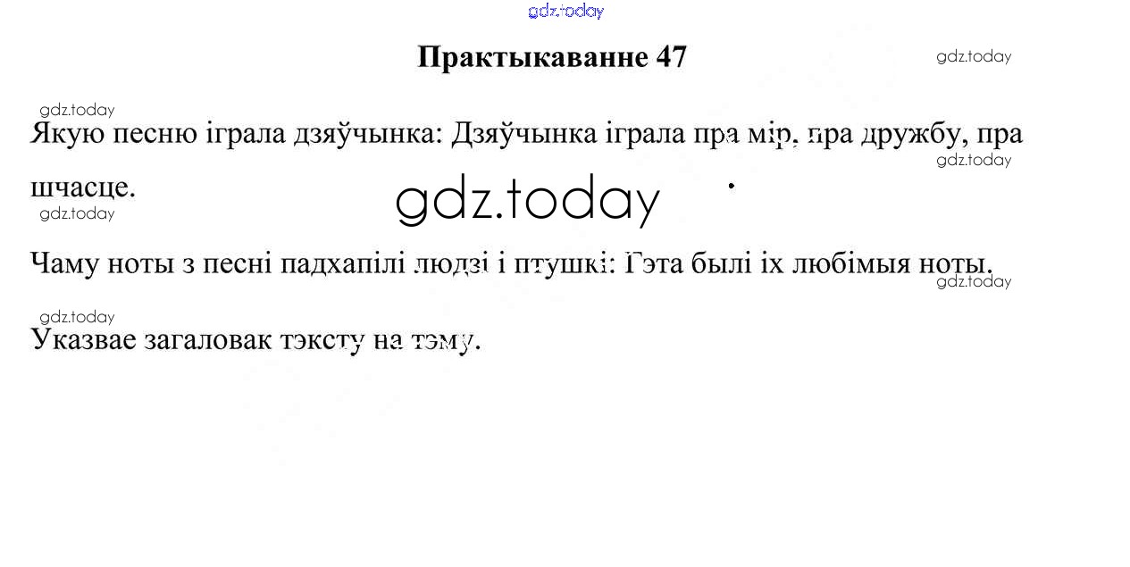 На страницах сайта gdz.today вы найдете учебный и вспомогательный материал, направленный на улучшения знаний школьной программы. ГДЗ - онлайн мир знаний Рашальнік да часткі 1. Практыкаванні 47 Учебнику по Белорусскому языку для 3 класса Свірыдзенка Национальный институт образования 2017