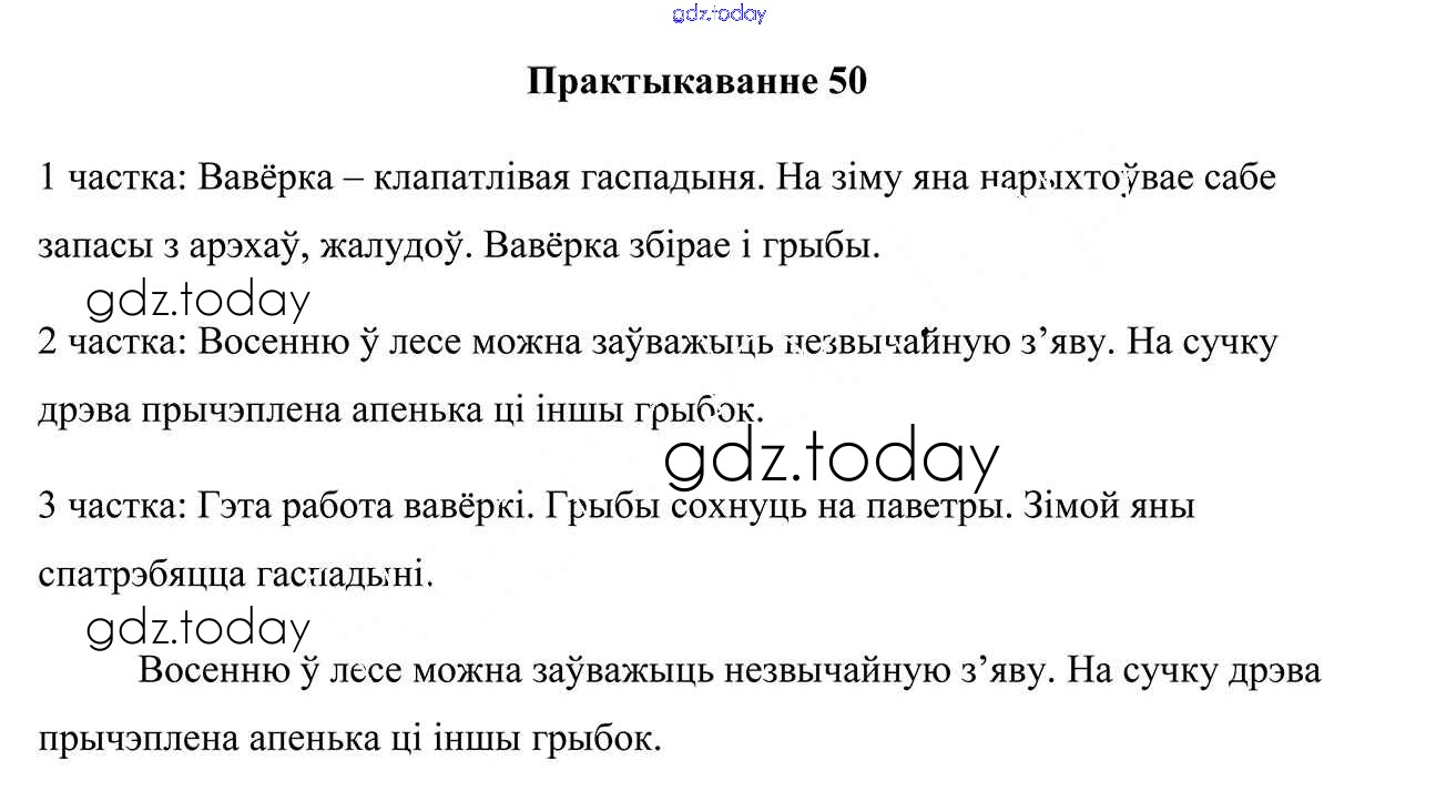 На страницах сайта gdz.today вы найдете учебный и вспомогательный материал, направленный на улучшения знаний школьной программы. ГДЗ - онлайн мир знаний Рашальнік да часткі 1. Практыкаванні 50 Учебнику по Белорусскому языку для 3 класса Свірыдзенка Национальный институт образования 2017