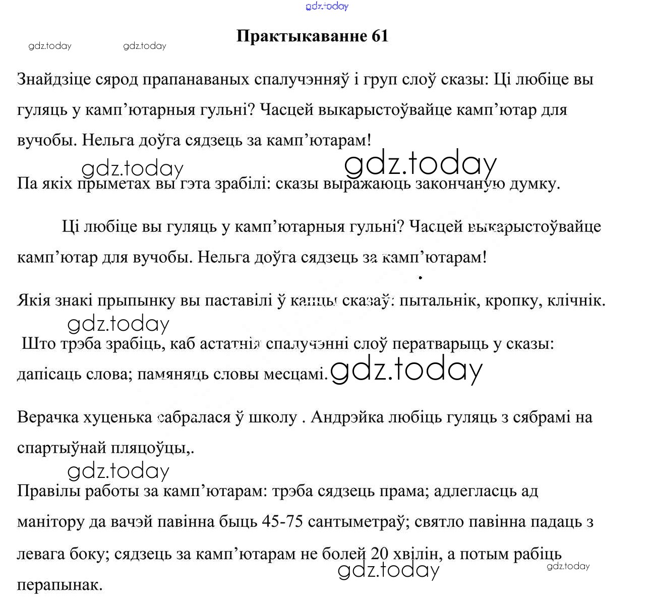 На страницах сайта gdz.today вы найдете учебный и вспомогательный материал, направленный на улучшения знаний школьной программы. ГДЗ - онлайн мир знаний Рашальнік да часткі 1. Практыкаванні 61 Учебнику по Белорусскому языку для 3 класса Свірыдзенка Национальный институт образования 2017