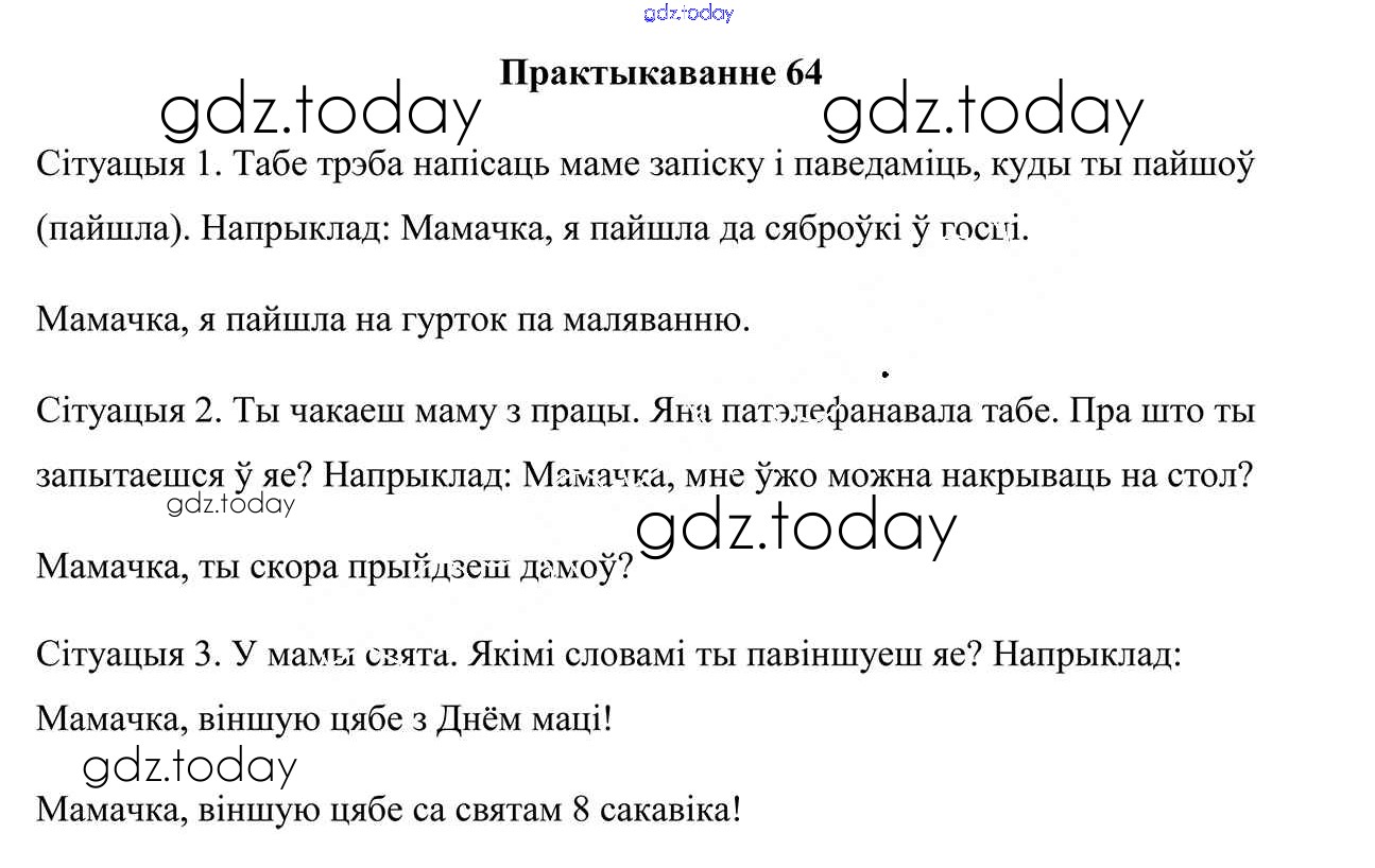 На страницах сайта gdz.today вы найдете учебный и вспомогательный материал, направленный на улучшения знаний школьной программы. ГДЗ - онлайн мир знаний Рашальнік да часткі 1. Практыкаванні 64 Учебнику по Белорусскому языку для 3 класса Свірыдзенка Национальный институт образования 2017