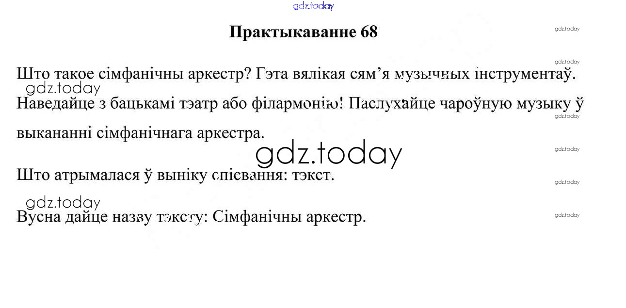 На страницах сайта gdz.today вы найдете учебный и вспомогательный материал, направленный на улучшения знаний школьной программы. ГДЗ - онлайн мир знаний Рашальнік да часткі 1. Практыкаванні 68 Учебнику по Белорусскому языку для 3 класса Свірыдзенка Национальный институт образования 2017