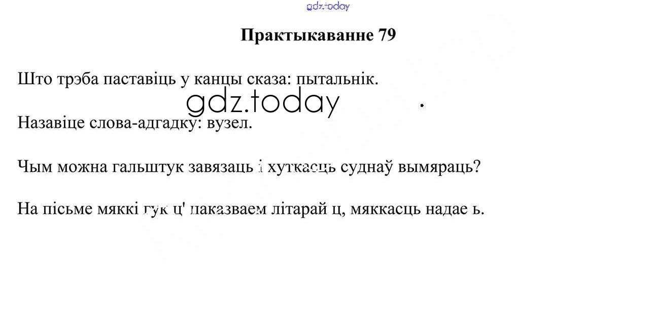 На страницах сайта gdz.today вы найдете учебный и вспомогательный материал, направленный на улучшения знаний школьной программы. ГДЗ - онлайн мир знаний Рашальнік да часткі 1. Практыкаванні 79 Учебнику по Белорусскому языку для 3 класса Свірыдзенка Национальный институт образования 2017
