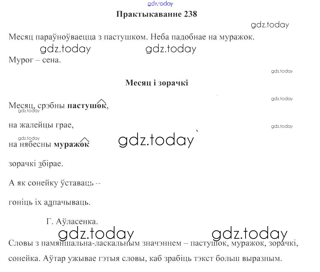 На страницах сайта gdz.today вы найдете учебный и вспомогательный материал, направленный на улучшения знаний школьной программы. ГДЗ - онлайн мир знаний Рашальнік да часткі 2. Практыкаванні 238 Учебнику по Белорусскому языку для 3 класса Свірыдзенка Национальный институт образования 2017